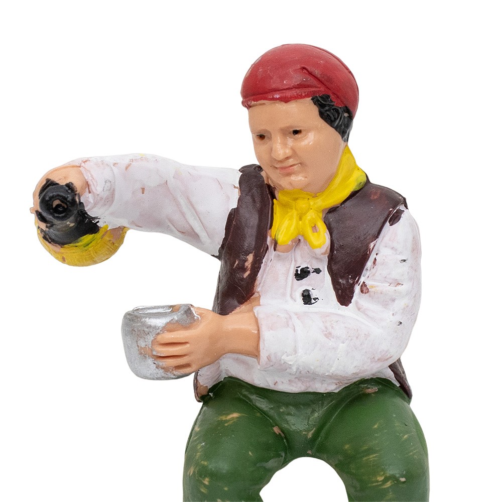 Uomo seduto con fiasco e bicchiere decorato e dipinto a mano, adatto per il presepe Euromarchi con altezza massima 10 cm.