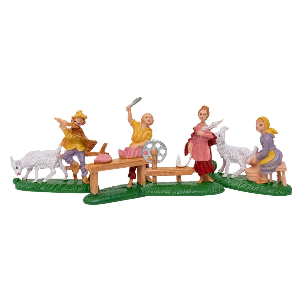 Set di 4 pastori con mestieri assortiti, proporzionati per presepe con altezza massima di 4 cm.
