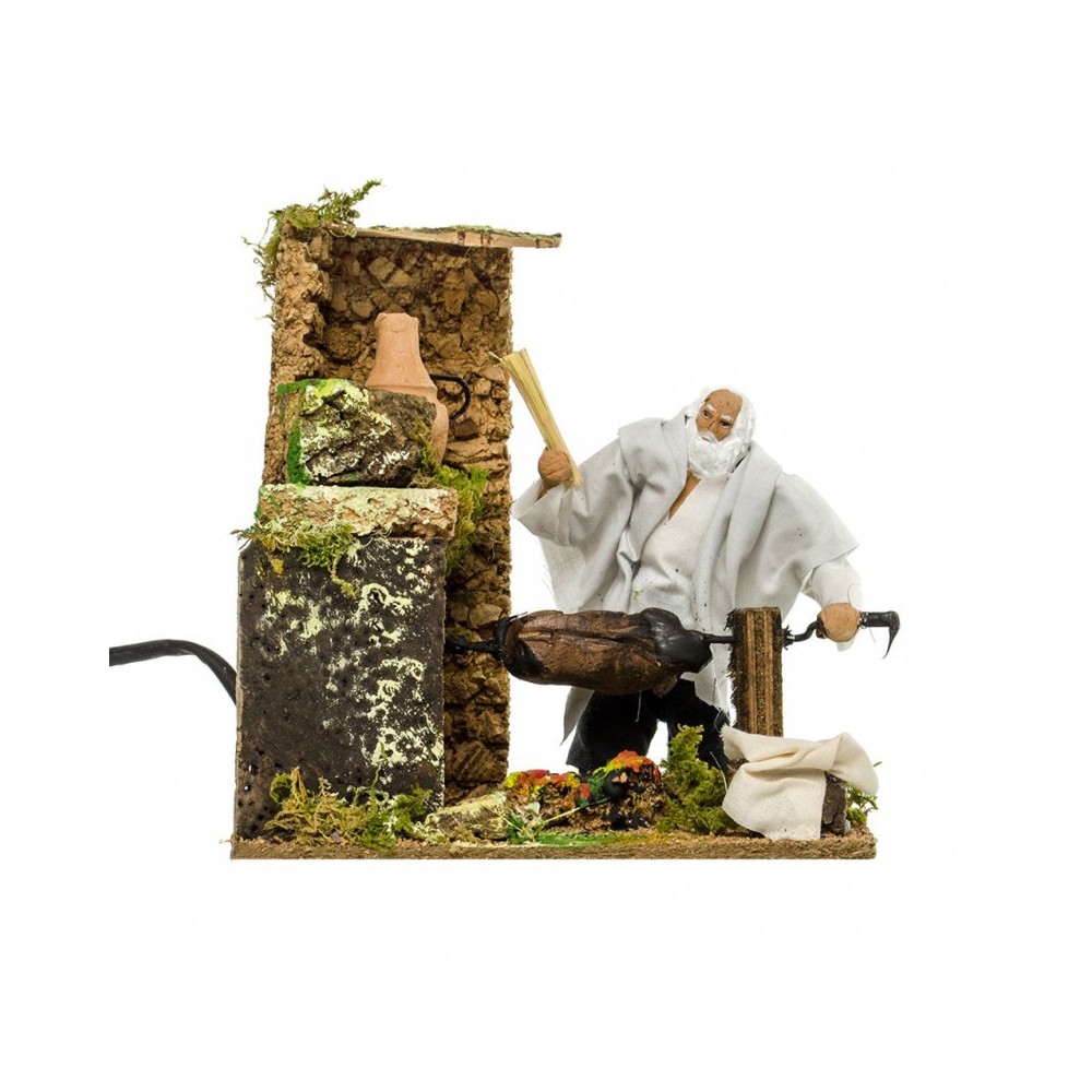 Porchettaio in Movimento per il Presepe. Questo personaggio è montato con motorino per il movimento, raffigura la scena di un uomo che cuoce la porchetta. Il personaggio è in terracotta, tipico napoletano, ed è alto 8 cm. La base del presepe misura 14x9 cm, mentre il punto più è di 15 cm.