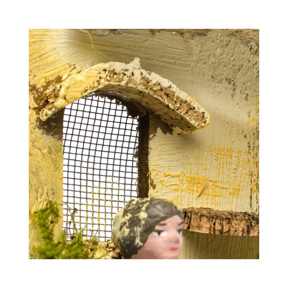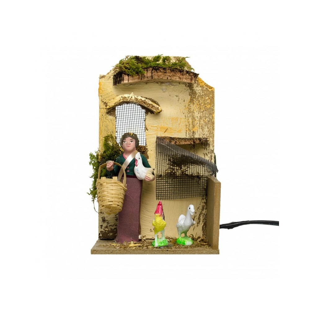 Pastorella che fa Mangiare le Galline. Personaggio in terracotta per il Presepe in Movimento. Il pupazzo è alto 10 cm ed ritrae la scena di una donna che lancia il cibo alle galline. La pastorella è collegata ad un motorino che consente il movimento. La struttura è alta 15 cm, la base misura 10x15 cm.