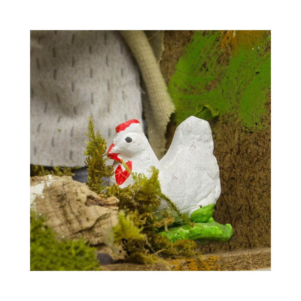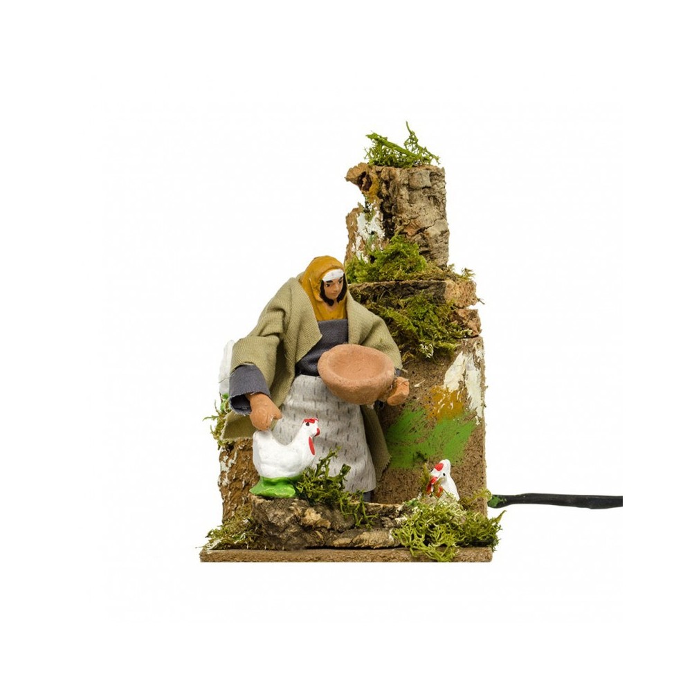 Donna con Galline per il Presepe. Personaggio in terracotta in movimento che raffigura la scena di un'anziana che da da mangiare alle galline. Il pupazzo, alto 10 cm, è collegato ad un motorino, posto sul retro della struttura, che ne consente il movimento. Misure: altezza totale 15cm; Base: 10x14.