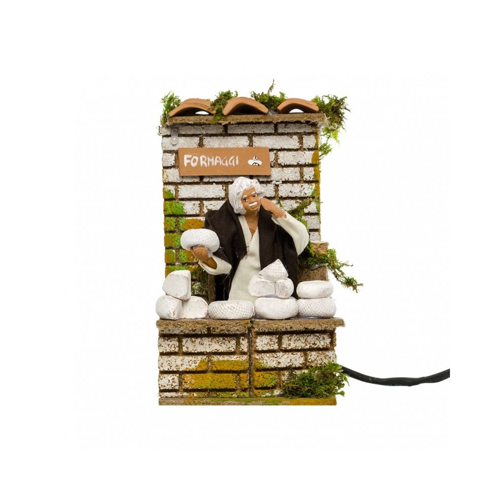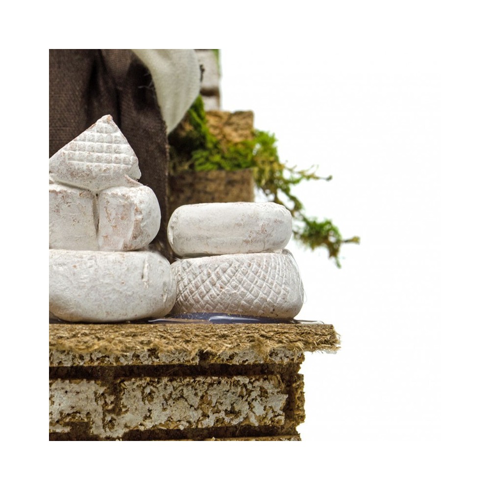 Venditore di Formaggi in Movimento. Il pupazzo, alto 10 cm, di terracotta è collegato ad un motorino che ne consente il movimento. Ideale per ogni Presepe, questa scena raffigura un anziano signore mentre vende i formaggi. La struttura, in legnoe s ughero dipinto a mano, è alta 17 cm. La base misura 10x15 cm.