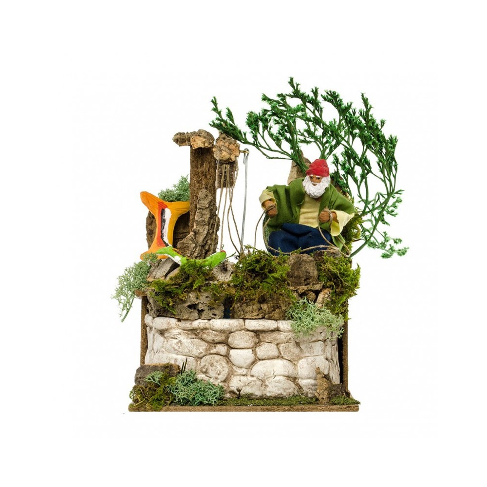 Questa scena del presepe raffigura un anziano pescatore con rete e pesci. Il personaggio è in terracotta, rifinito e pitturato interamente a mano. Completo di motorino elettrico, per azionare il movimento occorre inserire la presa a corrente.