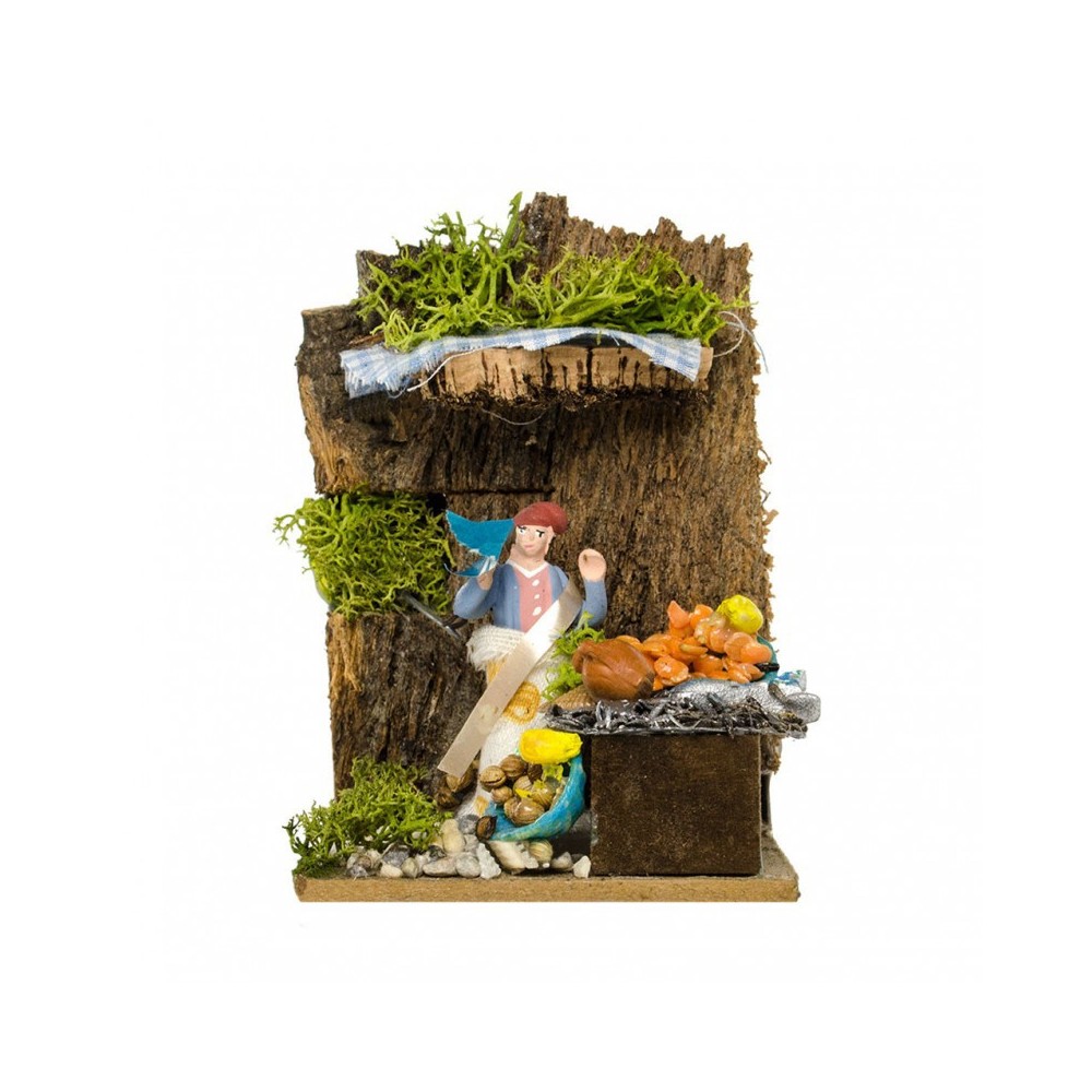 Scena ambientata per il presepe in movimento, raffigurante un pescivendolo a lavoro con banchetto di pesci. Il personaggio è alto 4,5 cm, realizzato in terracotta. Realizzato a mano interamente in Italia. Dotato di motorino elettrico.
