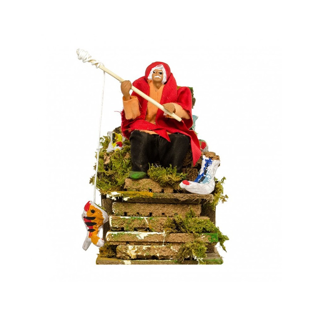 Raffigura un anziano pescatore con canna da pesca e pesci. Il personaggio è in terracotta, rifinito e pitturato interamente a mano. Completo di motorino elettrico, per azionare il movimento occorre inserire la presa a corrente.