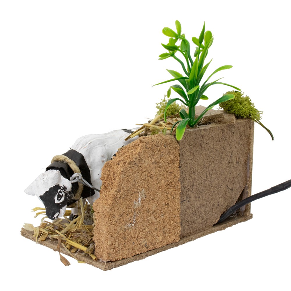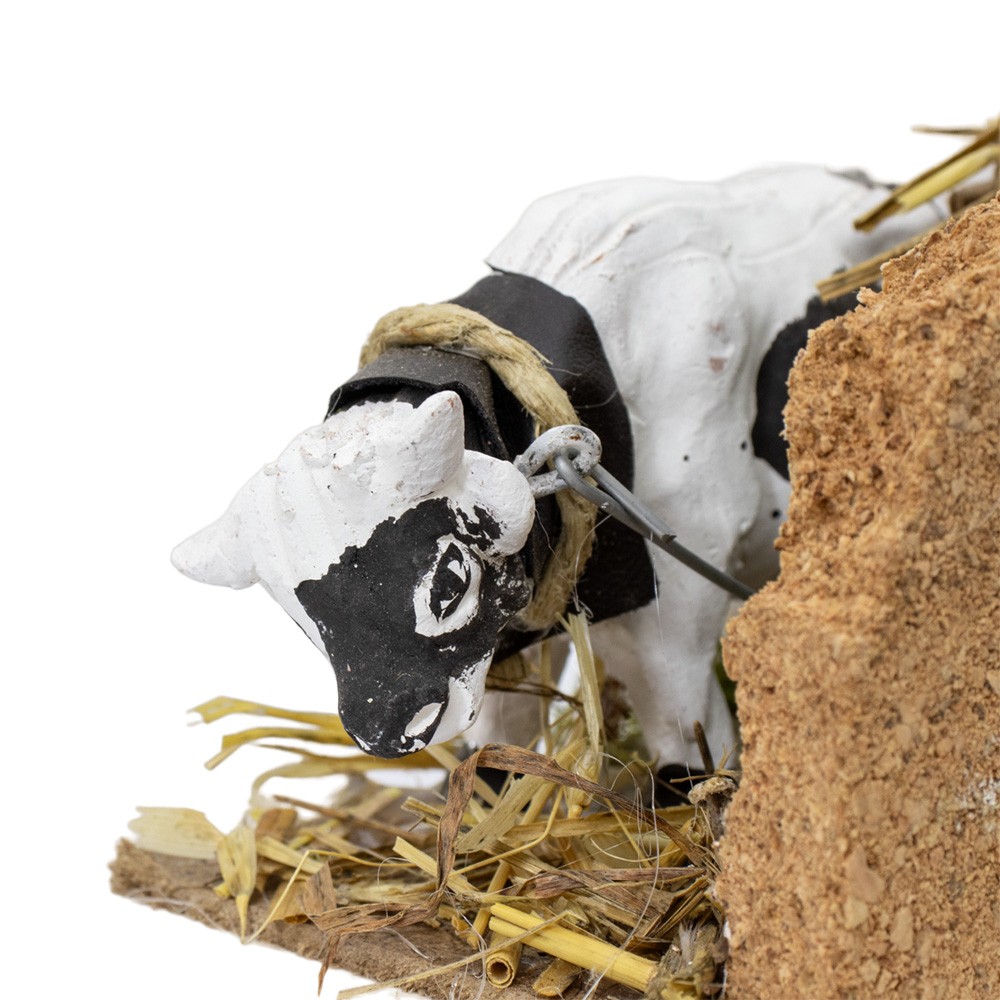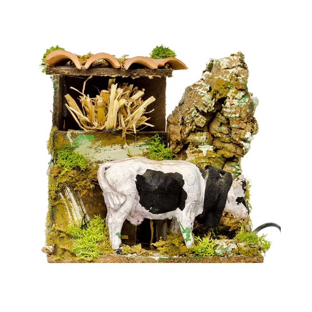 Scena Presepe in movimento: Bue che mangia. Raffigura un bue in una stalla che mangia, adatto a presepe di 8 cm. I materiali utilizzati sono legno, sughero, muschio e terracotta.