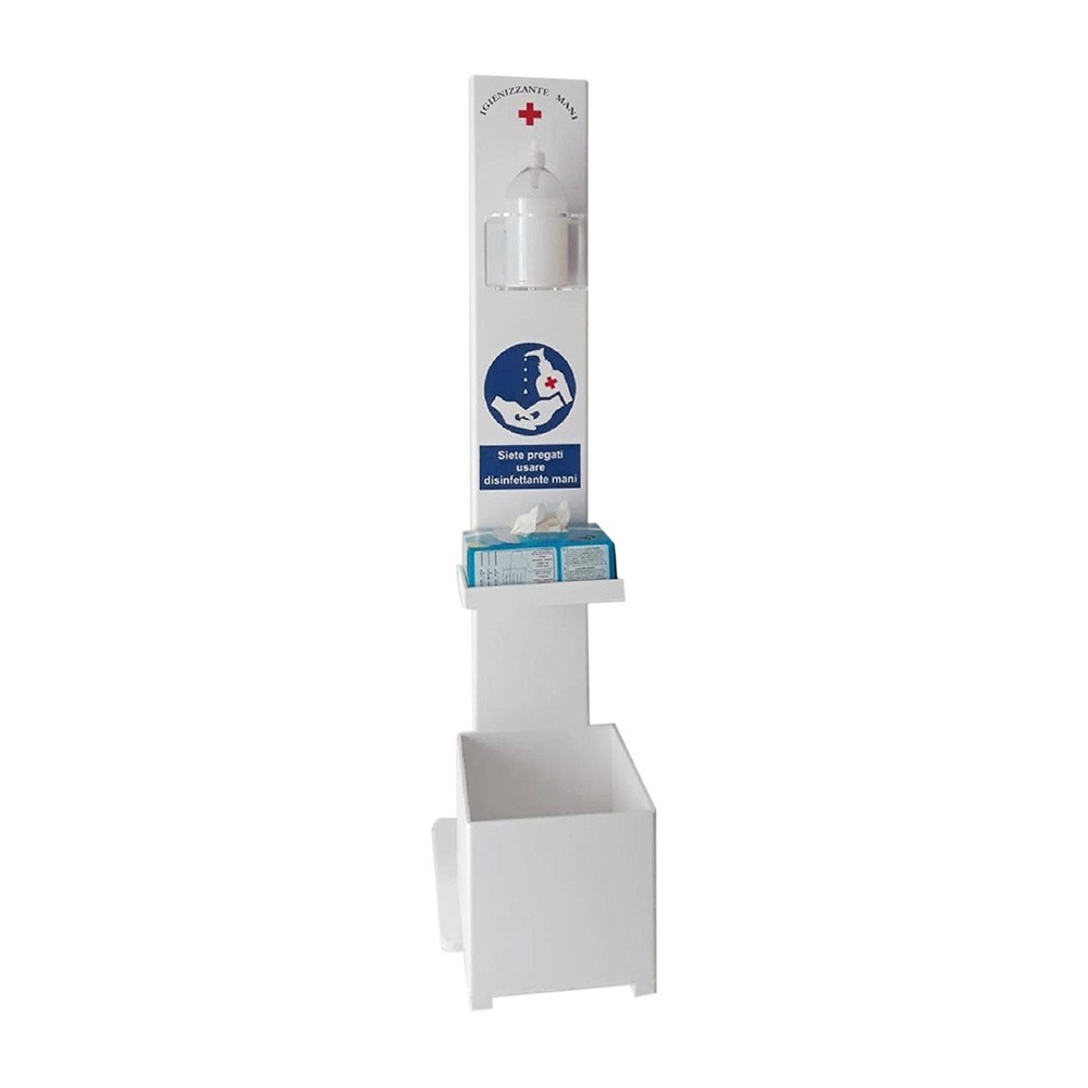 Piantana con porta dispenser per gel igienizzante. Realizzata in forex e plexiglass ed è adatta in qualsiasi ambiente. Completa di portaguanti e cestino rifiuti. Made in Itay.