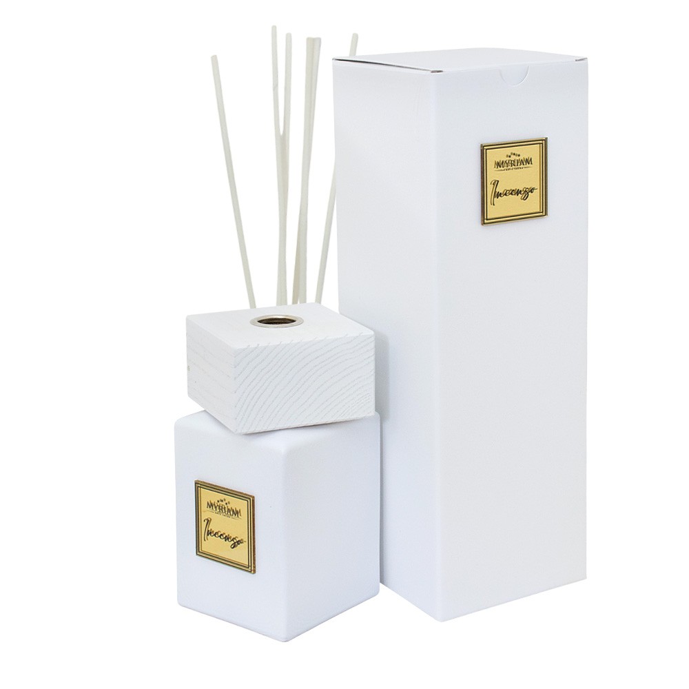 Profumatore d'ambiente alla fragranza INCENSO da 500 ml, completo di bastoncini. Packaging elegante con placchetta a specchio color oro e tappo in legno.