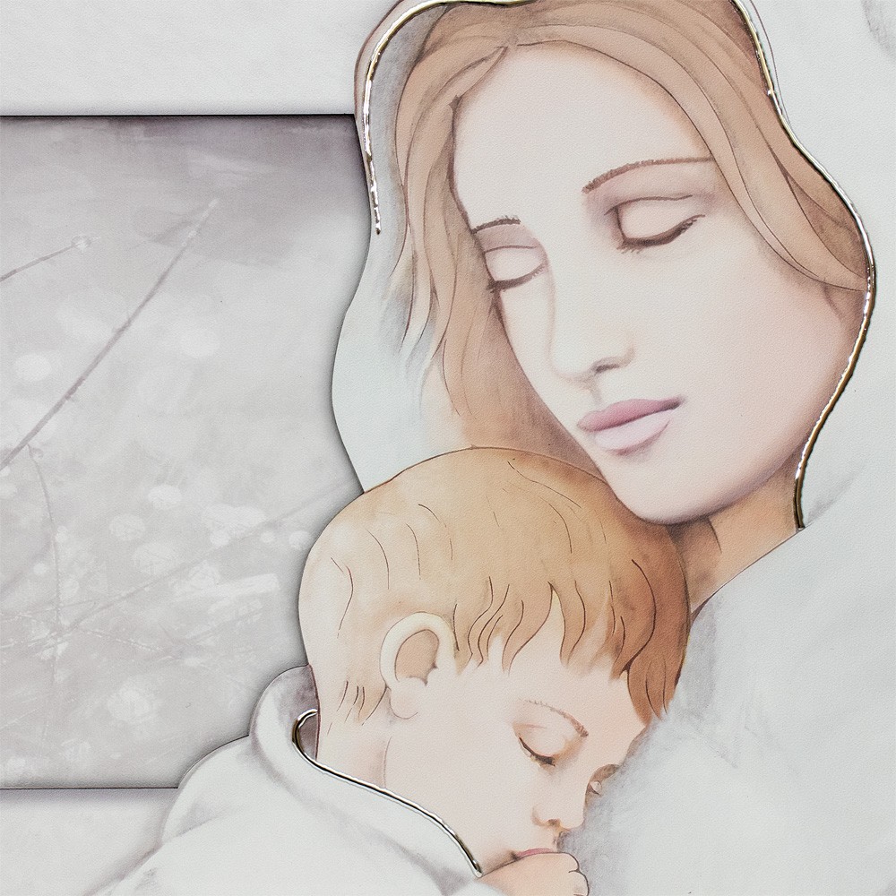 Realizzato su pannello in legno, l'immagine della Madonna con il bambino è rifinita a mano sia nei dettagli che nelle decorazioni in argento laminato.