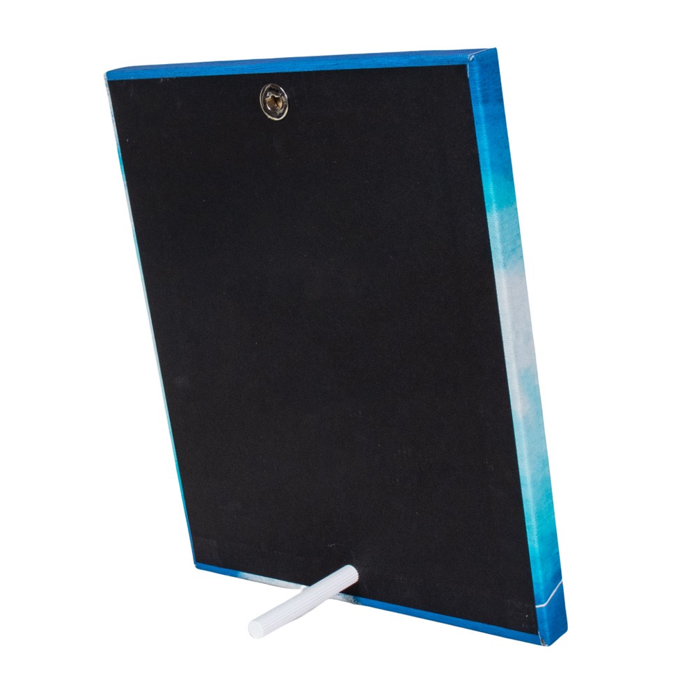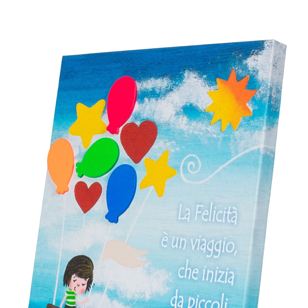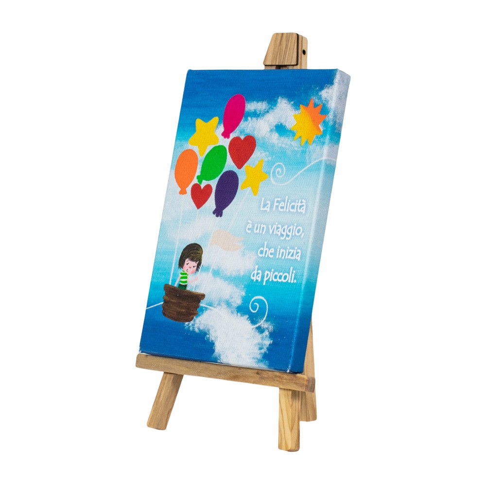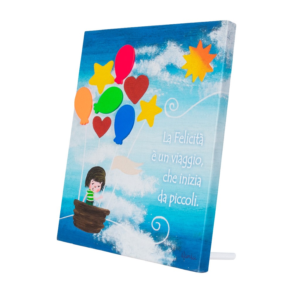Il quadretto è realizzato su tela con stampa fondo azzurro e frase:
