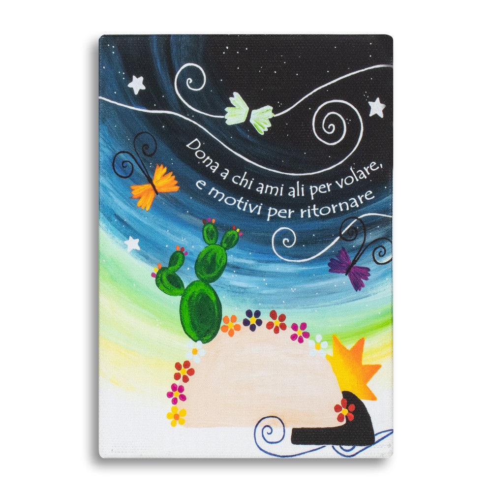 Questo grazioso quadro è con stampa su fondo decorato e frase: " Dona a chi ama ali per volare e motivi per ritornare. "
