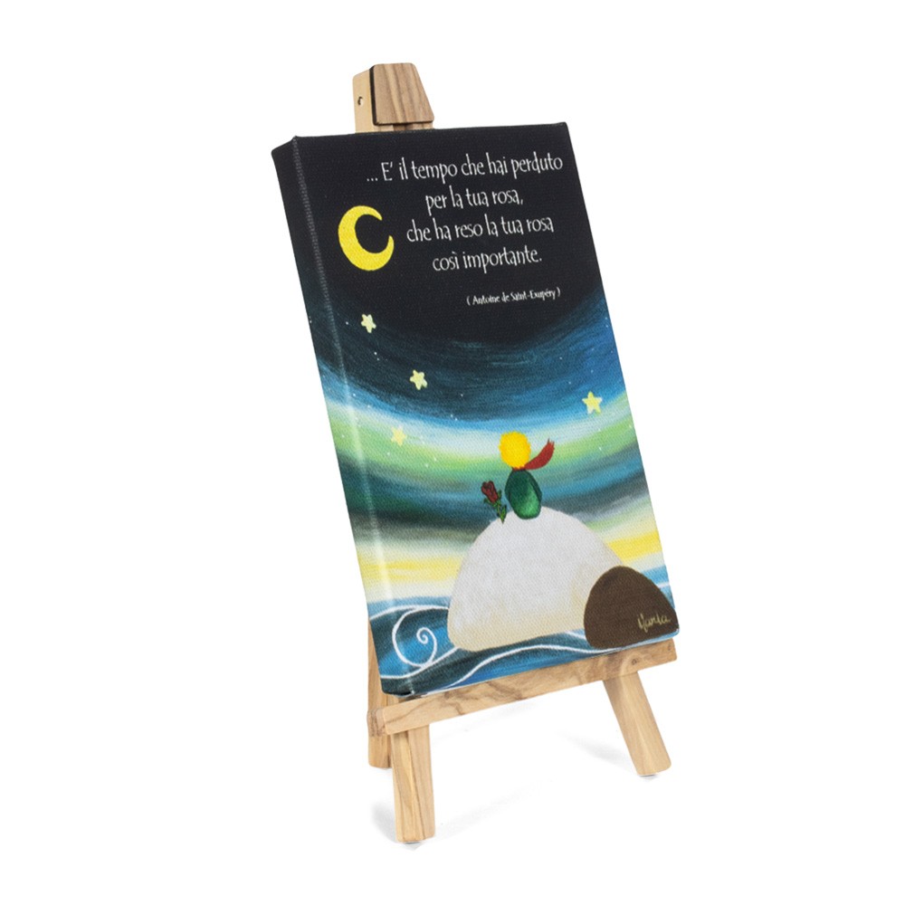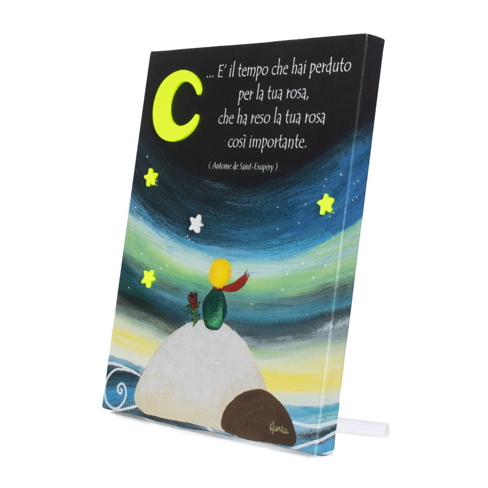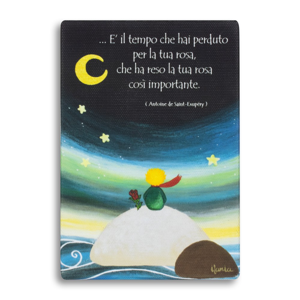 Quadretto Piccolo Principe realizzato su tela con immagini stampate e frase: " E' il tempo che hai perduto per la tua rosa, che ha reso la tua rosa cosi' importante.".
