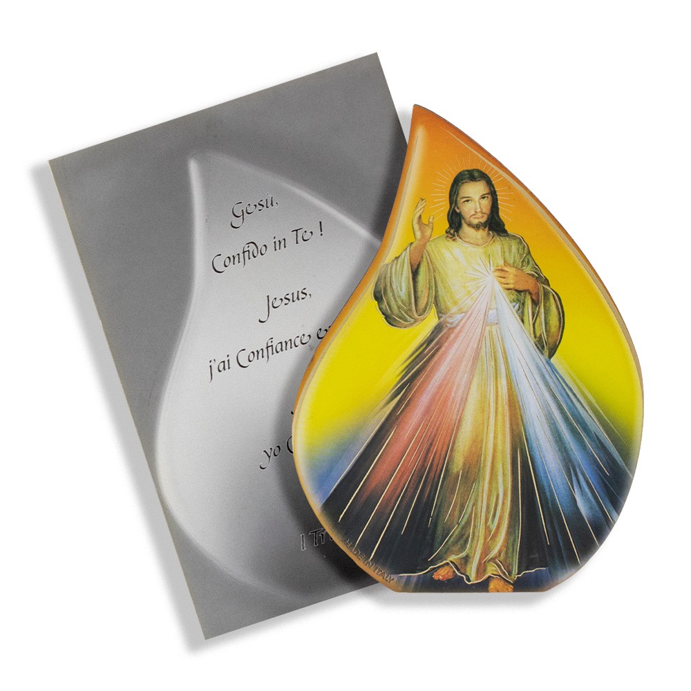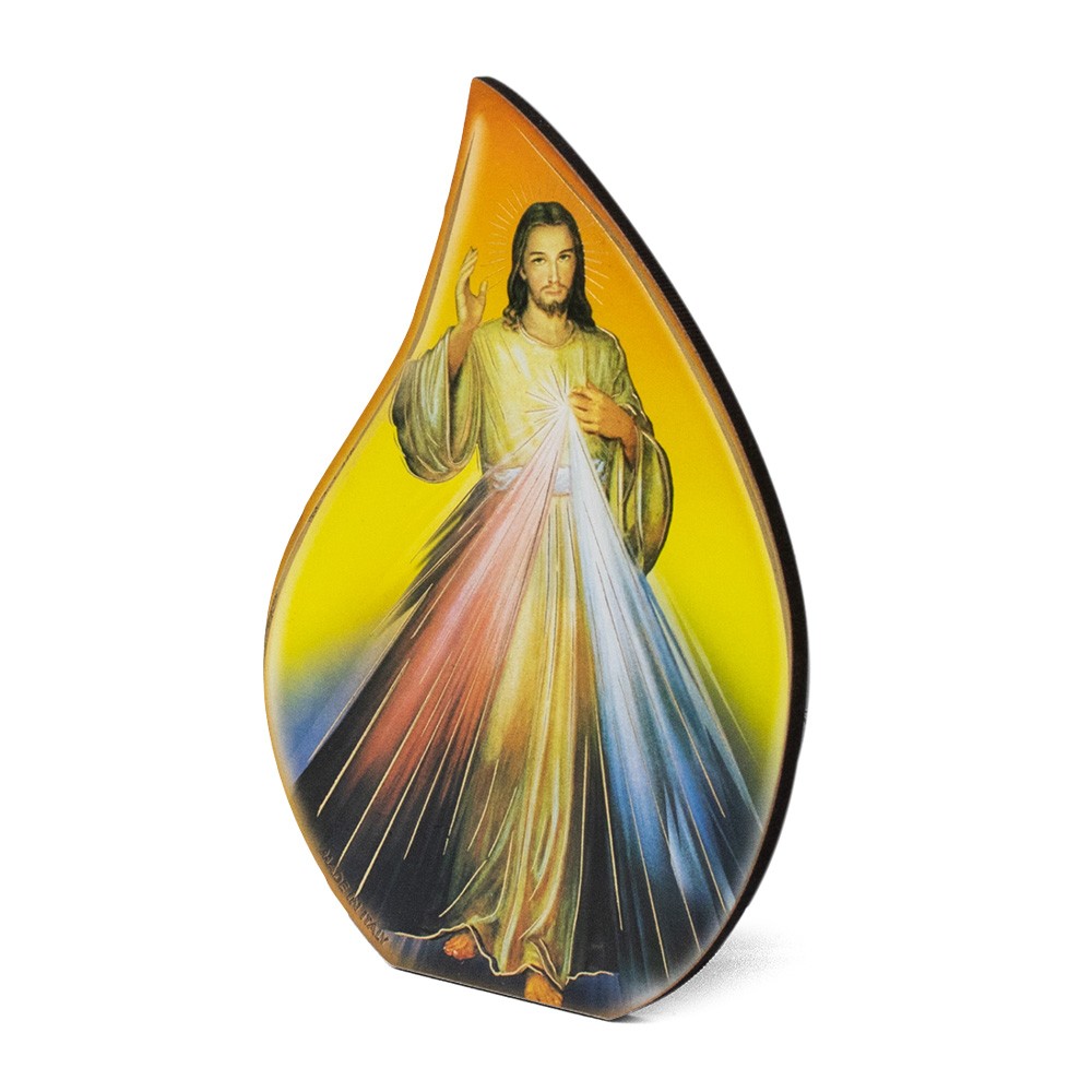 Il quadretto è a forma di fiammella interamente in legno MDF, corredato di piedino d'appoggio in metallo e cartoncino con immagine di Gesù Misericordioso..