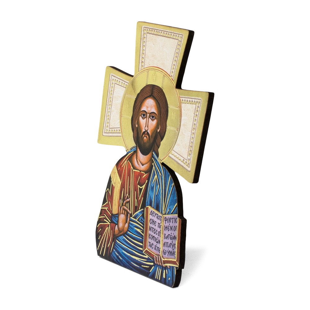 Quadretto Gesù Pantocratore in legno sagomato a forma di croce e stampa in foglia oro.