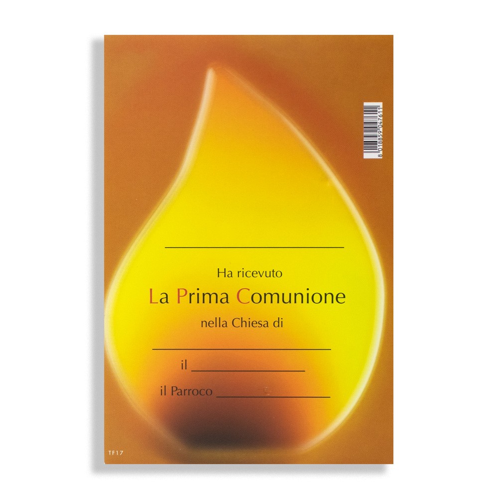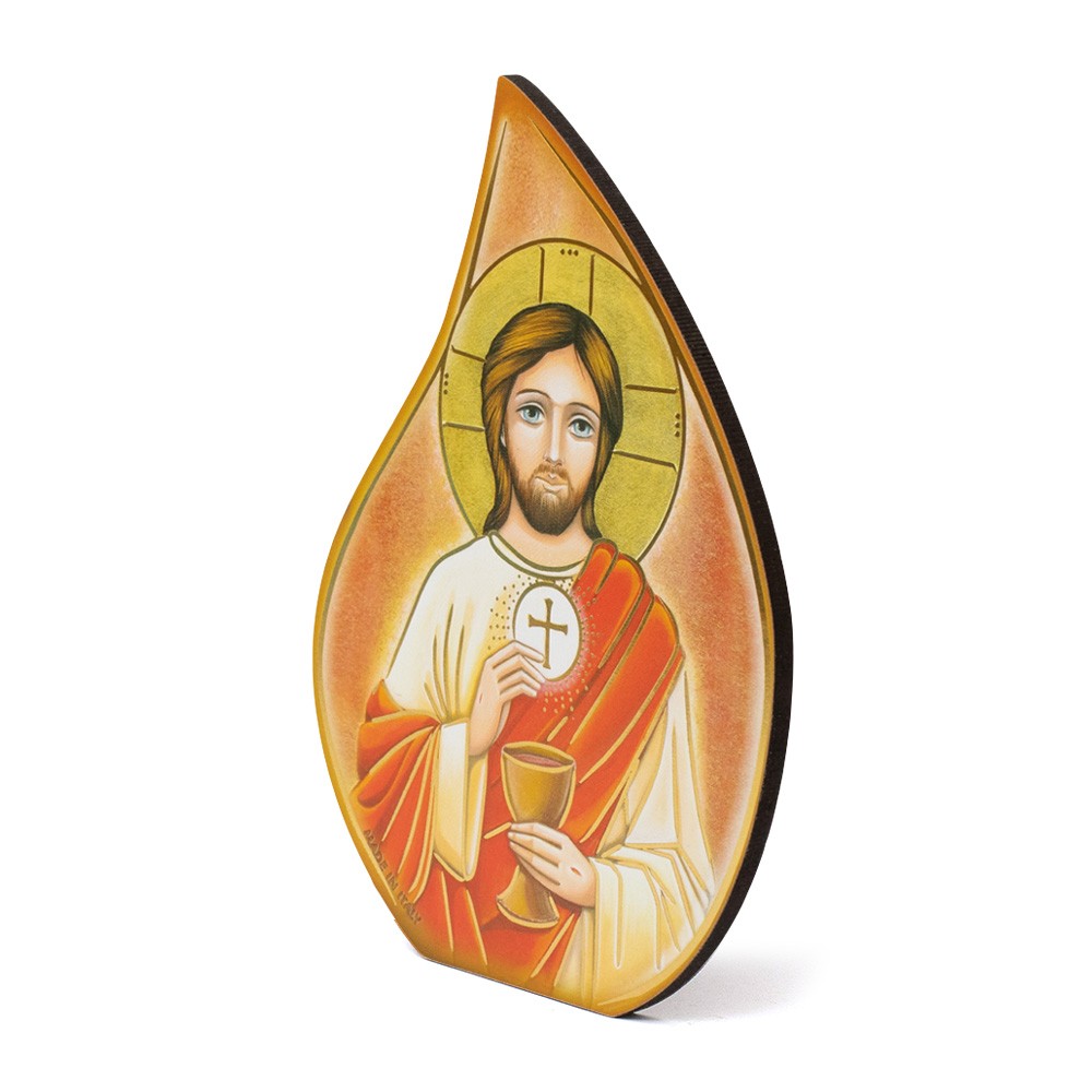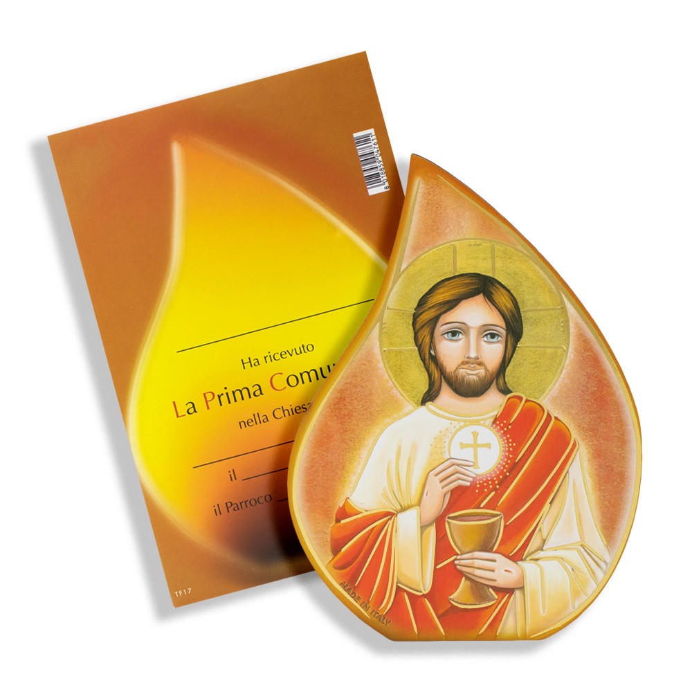 Realizzato in legno MDF a forma di fiammella, munito di piedino d'appoggio in metallo e cartoncino pergamena ricordo per la Santa Comunione.