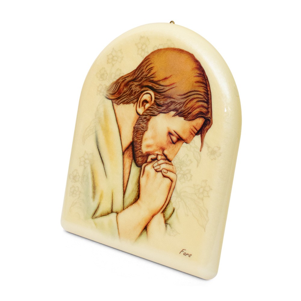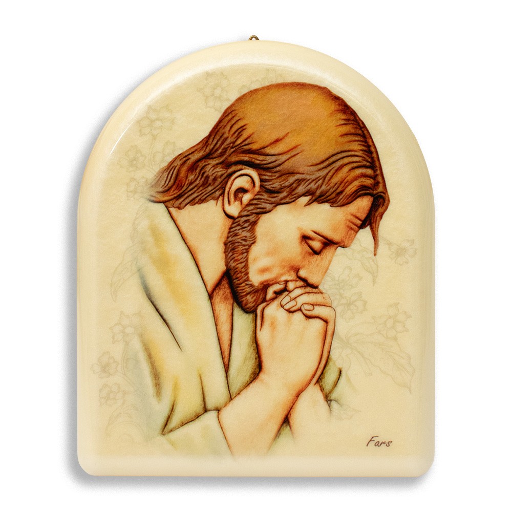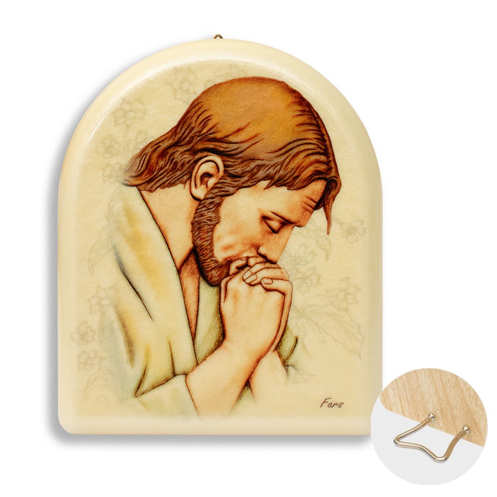 Quadretto con effetto perlato a forma di cupola e immagine stampata raffigurante Gesù in preghiera.