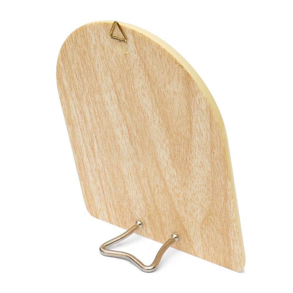 Il quadretto viene fornito sia di piedino in metallo argentato per essere appoggiato che di triangolino in metallo per poterlo appendere.