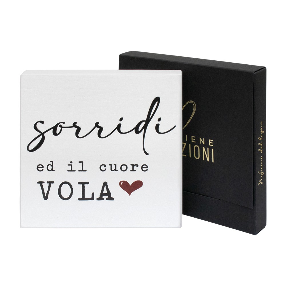 Quadretto con frase Sorridi ed il cuore vola, fornito in elegante cofanetto regalo. 100% made in Italy.