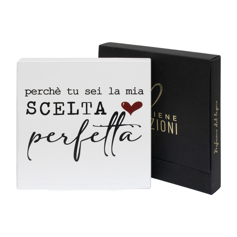Quadretto con frase Perché tu sei la mia scelta perfetta, fornito in elegante cofanetto regalo. 100% made in Italy.