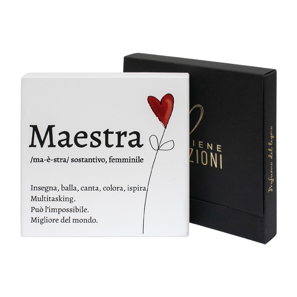 Un quadretto pensato per celebrare il legame speciale con la maestra. La scritta MAESTRA è suddivisa anche in sillabe (ma-e-stra) ed è accompagnata da frasi che ne esaltano il ruolo prezioso: