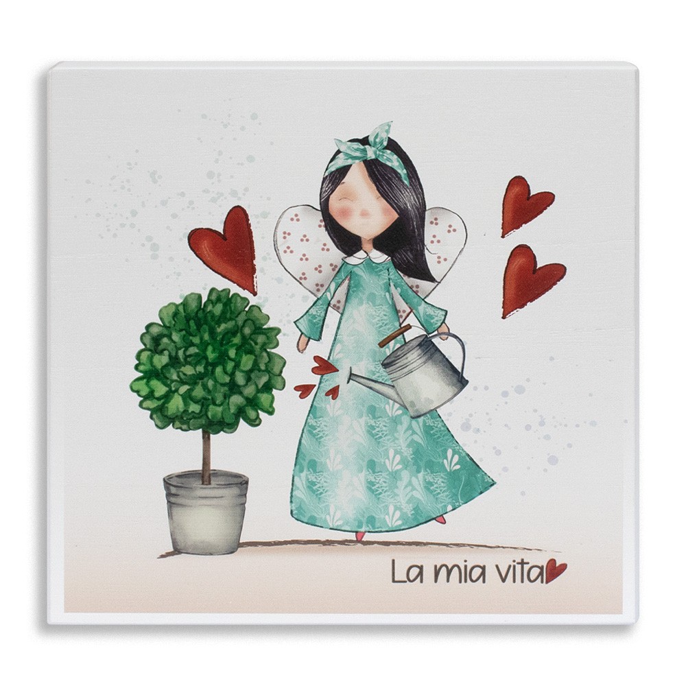 Un quadretto raffinato con la frase "La mia Vita", accompagnato da una delicata illustrazione di un angioletto che si prende cura una piantina, simbolo di crescita, amore.