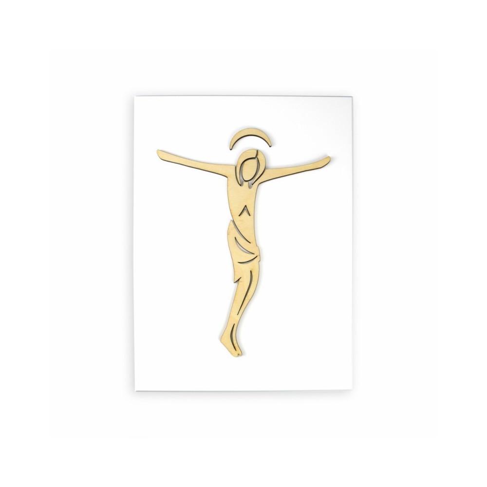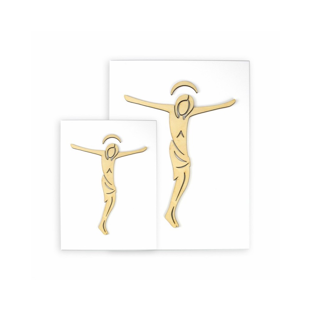Quadretto realizzato su un pannello di legno laccato bianco con immagine intagliata a laser in rilievo, raffigurante il corpo del Cristo. Fornito di scatola.