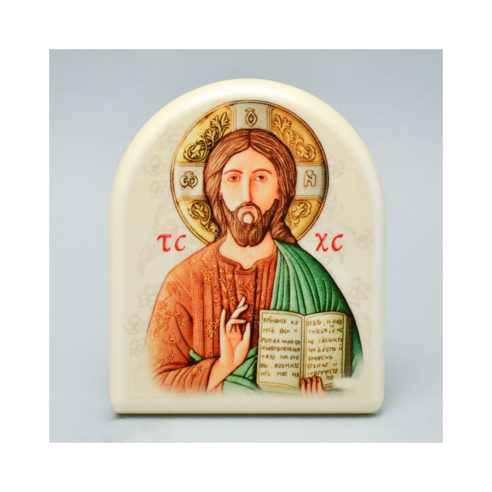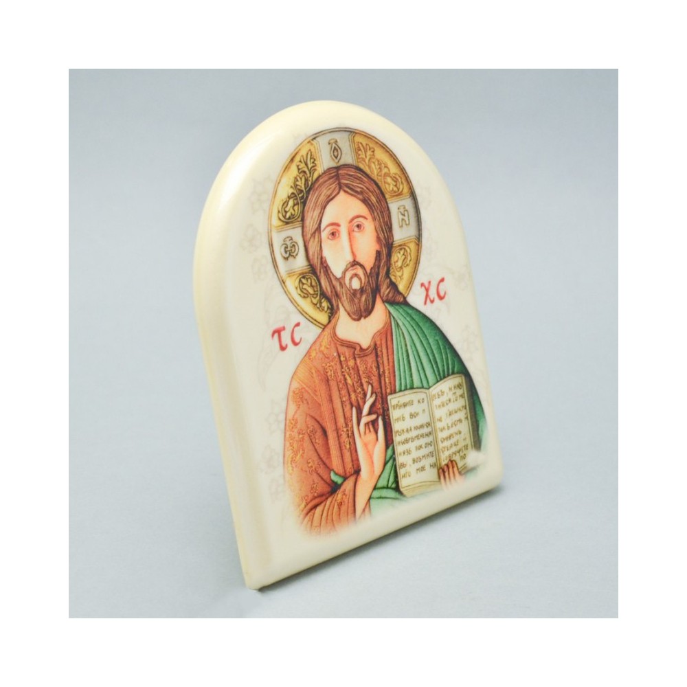 Quadretto con immagine di Gesù Pantocratore a forma di cupola. Questo splendido quadretto effetto perlato lucido, viene fornito di piedino in metallo per essere appoggiato e triangolino per poterlo appendere.