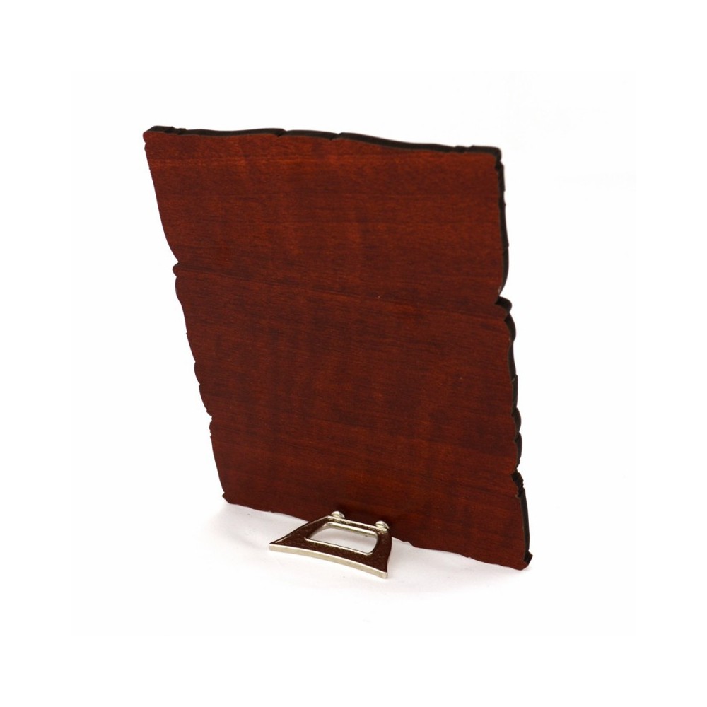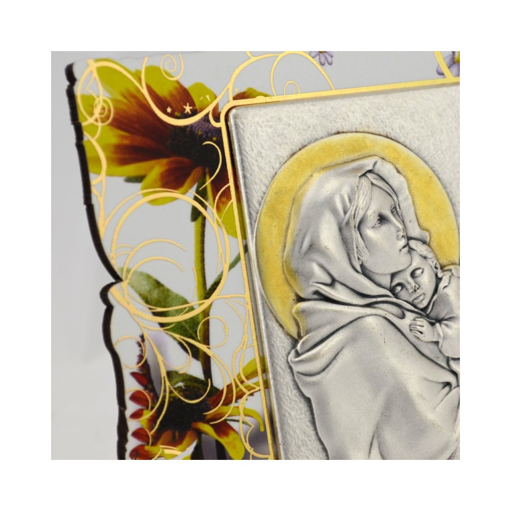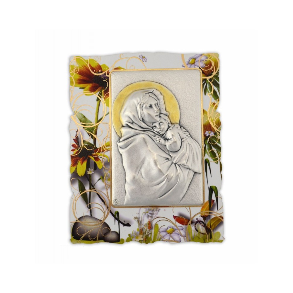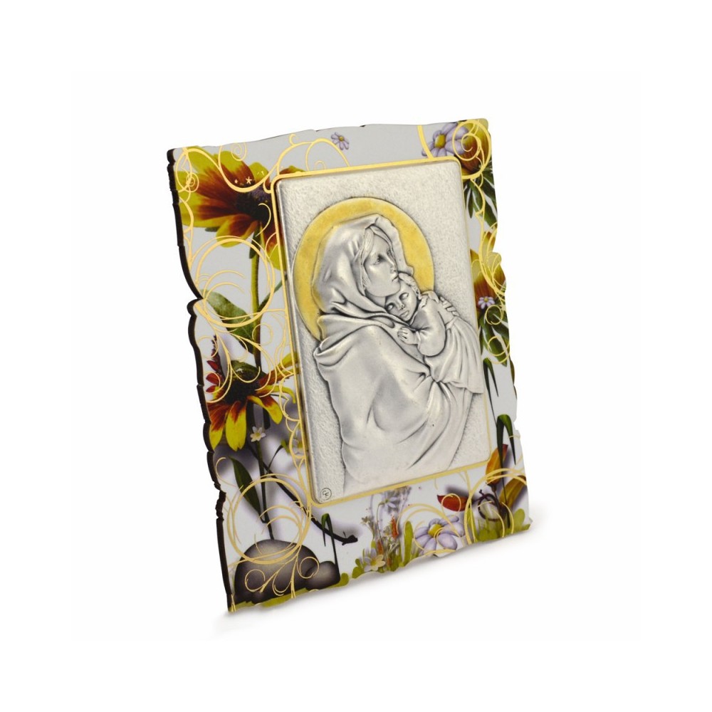 Quadretto sagomato in legno decorato, con placchetta applicata. La placchetta è realizzata in zama argentata raffigurante l'immagine della Madonna del Ferruzzi. Corredato di piedino d'appoggio. Scatolato.