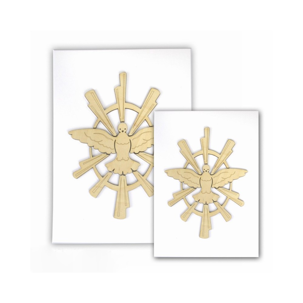 Realizzato su un pannello di legno laccato bianco con particolare intaglio a laser. Può essere usato come appoggio (con piedino in metallo) o appeso al muro. Ideale come bomboniera per la Cresima. Corredato di scatola. Made in Italy.