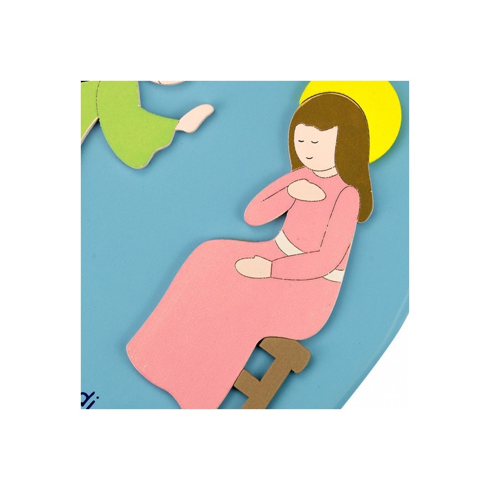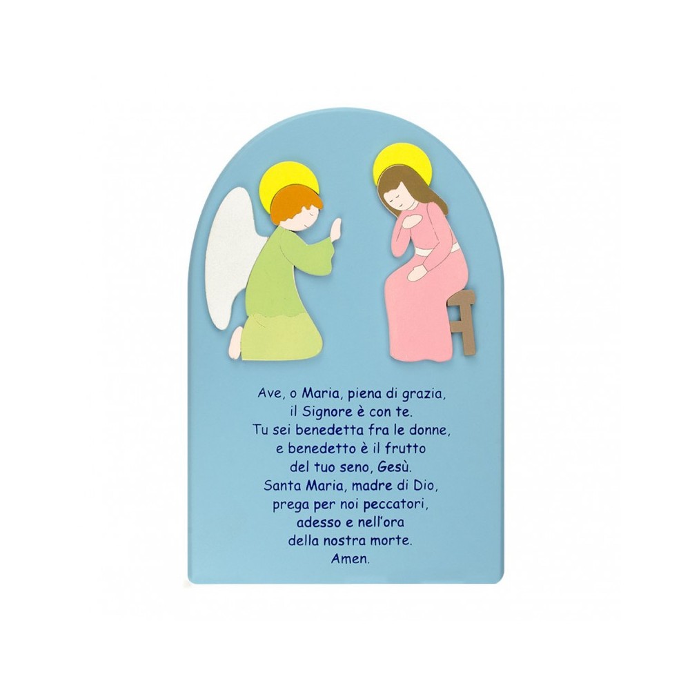 Quadretto a forma di arco con preghiera Ave Maria, raffigura in rilievo l'Annunciazione dell'Angelo a Maria alla Vergine. Il quadretto è realizzato in legno dipinto di colore azzurro tenue, misura 24x16 cm. Ottima idea regalo ai bambini per arredare le camerette. Confezionato in scatola colorata.