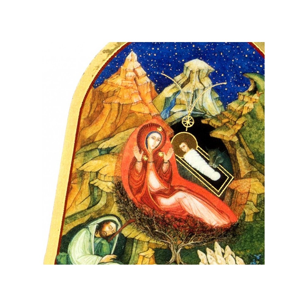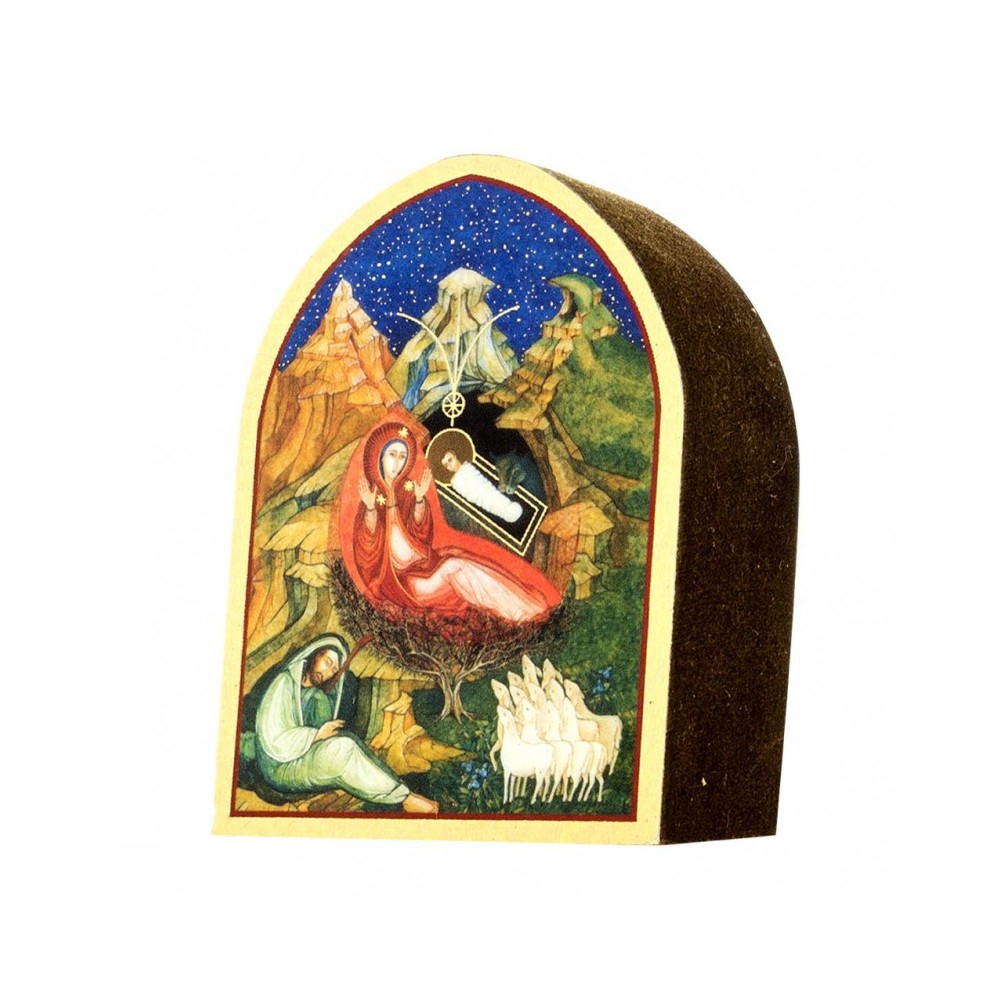 Quadro cupola in legno con raffigurazione di una graziosa Natività. Il quadretto è realizzato in legno con stampa oro a caldo, misura 5,5x7,5 cm. Prodotto made in Italy. Confezionato in elegante scatola.