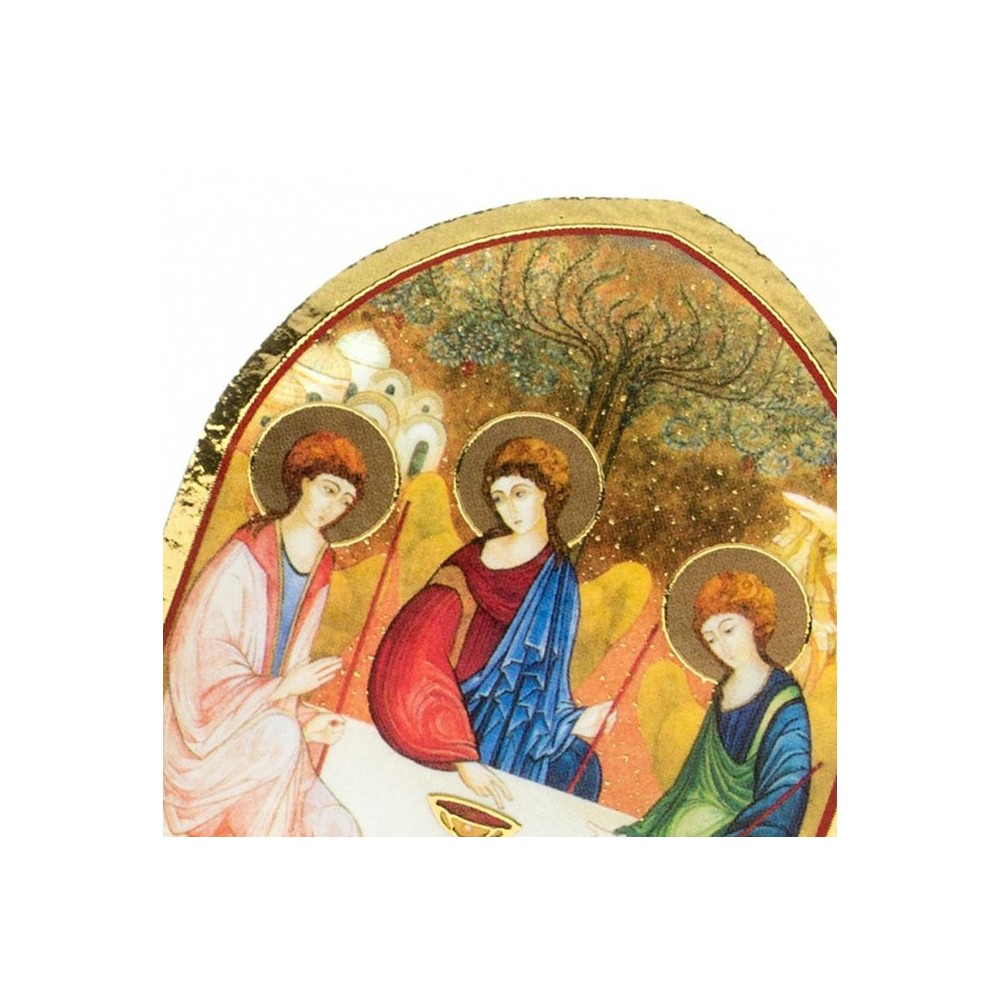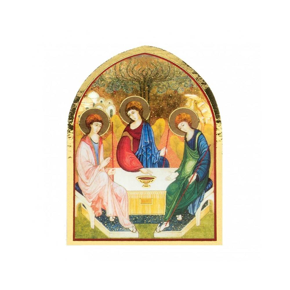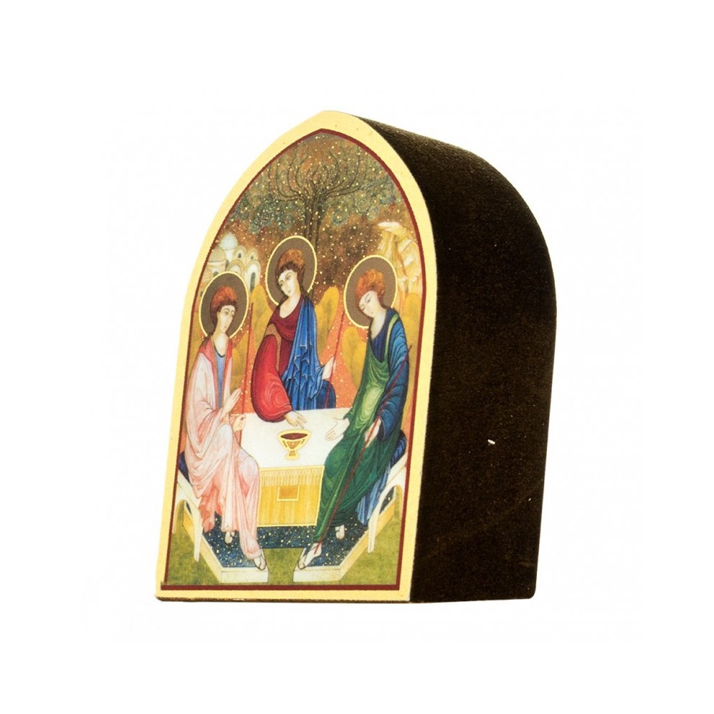 Quadro Santissima Trinità a forma di cupola in legno. Il quadretto è realizzato in legno con stampa oro a caldo, misura 5,5x7,5 cm. Prodotto made in Italy. Confezionato in elegante scatola.