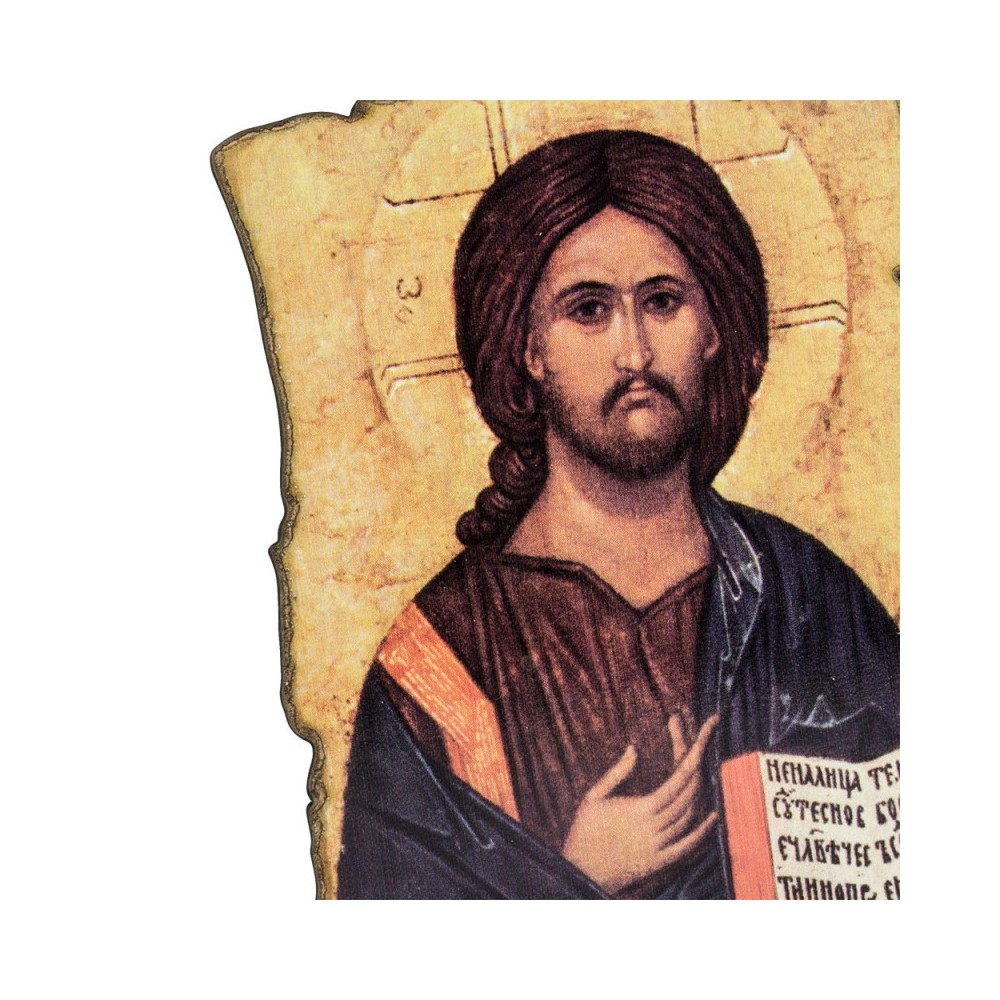Quadretto in legno con immagine stampata di Gesù Pantocratore. Il quadretto è realizzato in legno a forma di pergamena con immagine di Gesù Pantocratore.