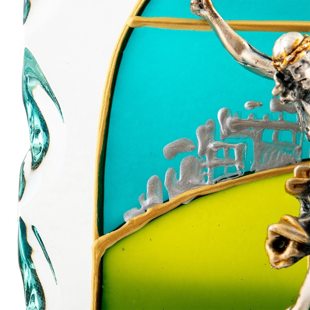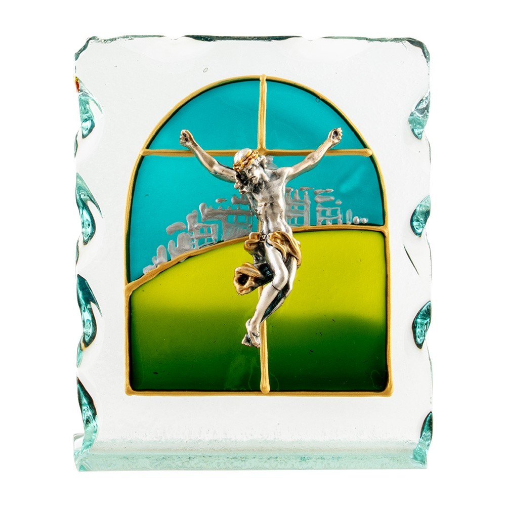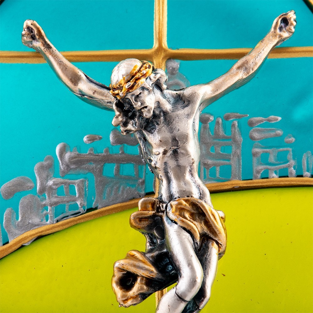 Questo quadretto sacro è in vetro finemente dipinto a mano. Sul quadretto vi è applicato in rilievo il Corpo di Cristo realizzato in resina in bagno argento. Articolo made in Italy.