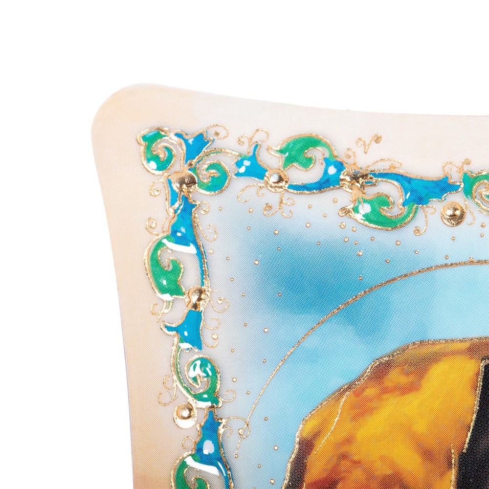 Piccolo quadro sagomato effetto lucido arricchito con greche colorate con immagine oro a caldo della Madonna del Ferruzzi. Realizzato in polimero. Può essere usato sia come quadretto da parete che d'appoggio (completo di triangolino e piedino in metallo argentato). Il quadretto misura 15 x 10 cm.