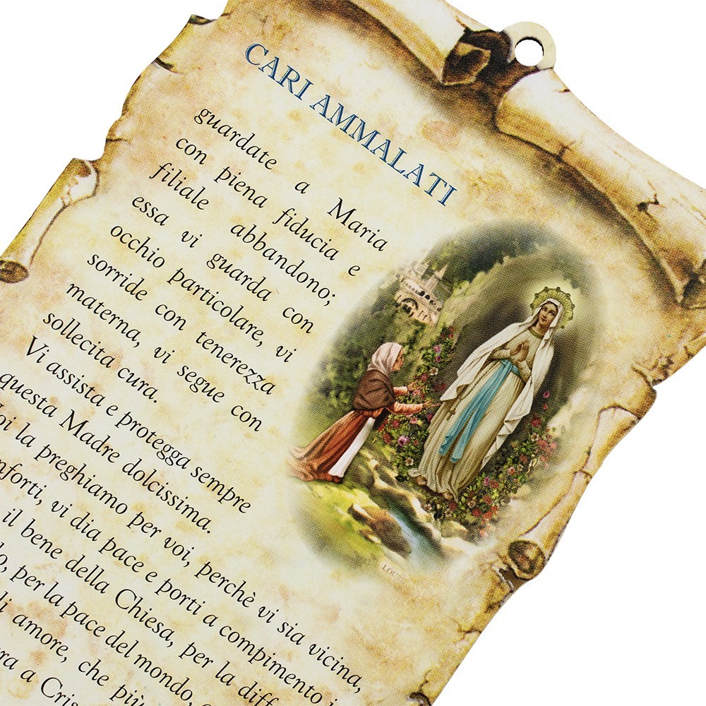 Quadretto a forma di pergamena con preghiera stampata per i "Cari ammalati". Completo di foro per appenderlo.