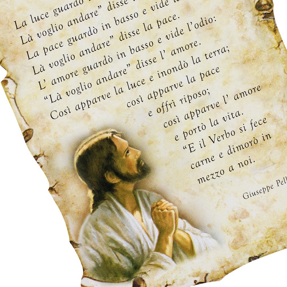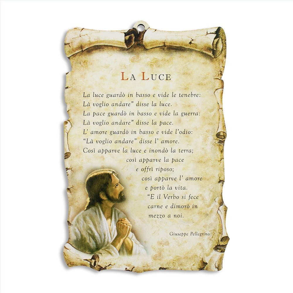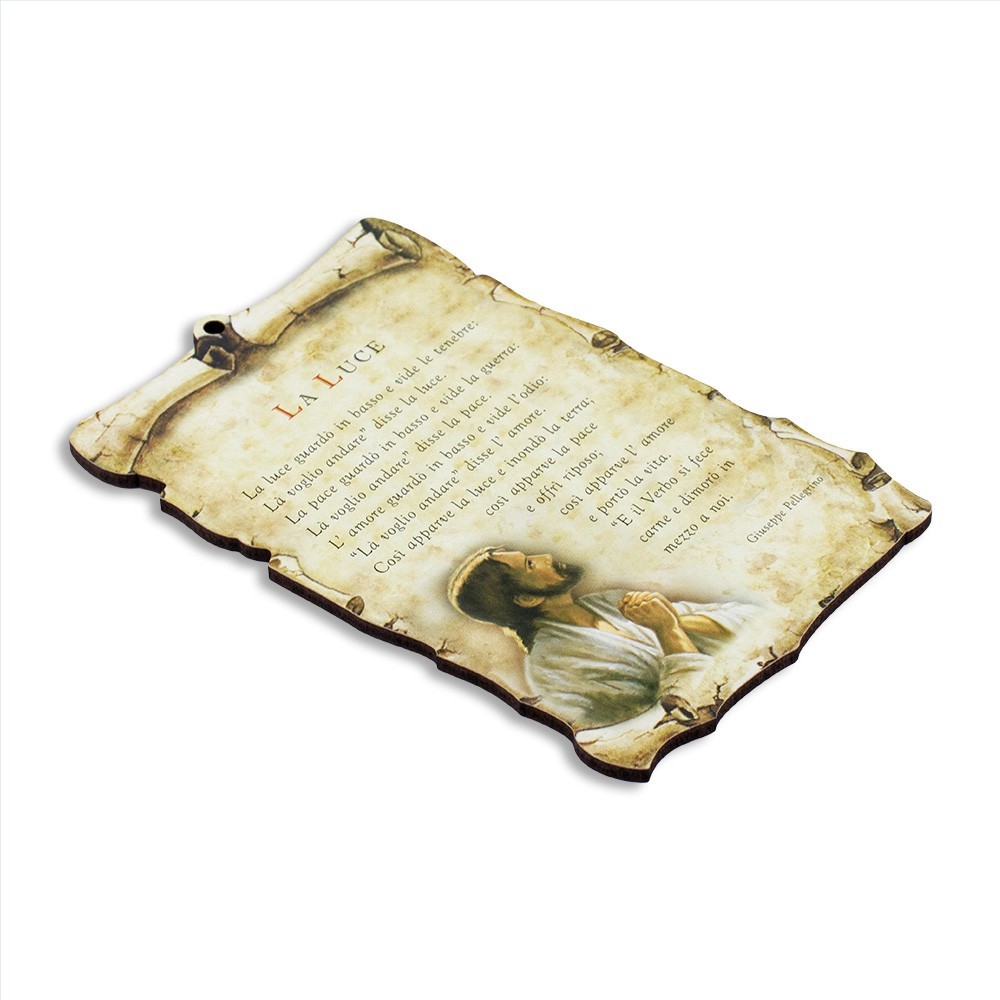 Quadretto sagomato a forma di pergamena con preghiera La Luce. Il quadretto misura 13x9 cm ed è realizzato interamente in MDF. Completo di foro per essere appeso.