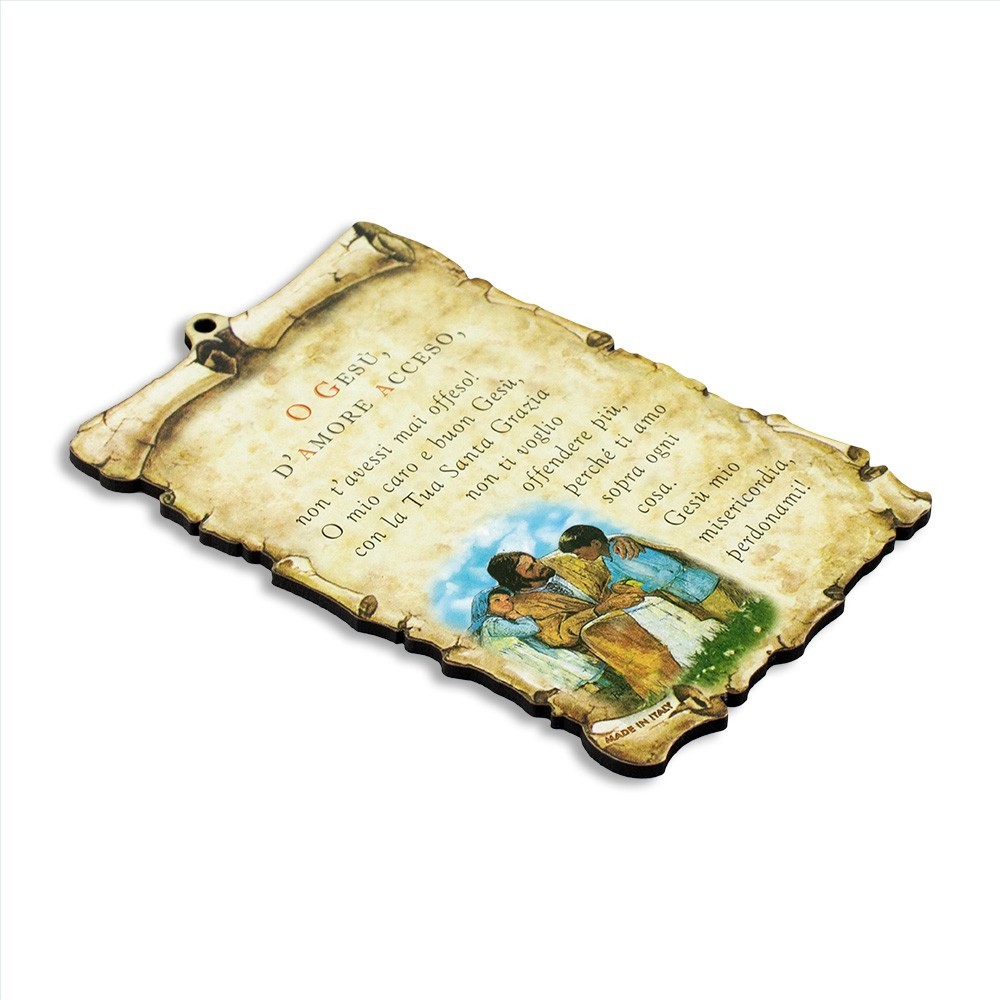 Quadretti con preghiera a forma di pergamena. Il quadretto misura 13x9 cm ed è realizzato interamente in MDF. Completo di foro per essere appeso.
