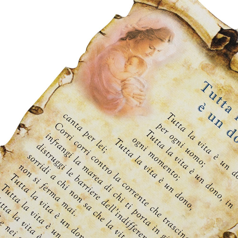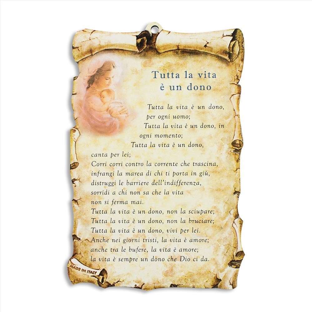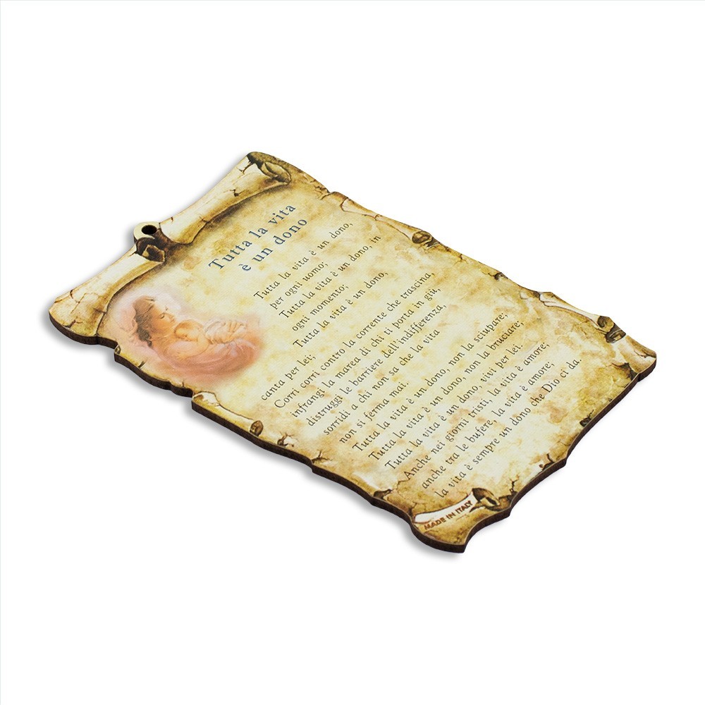 Quadretto sagomato a forma di pergamena con preghiera stampata " Tutta la vita è un dono ". Realizzato interamente in MDF e munito di foro per essere appeso.