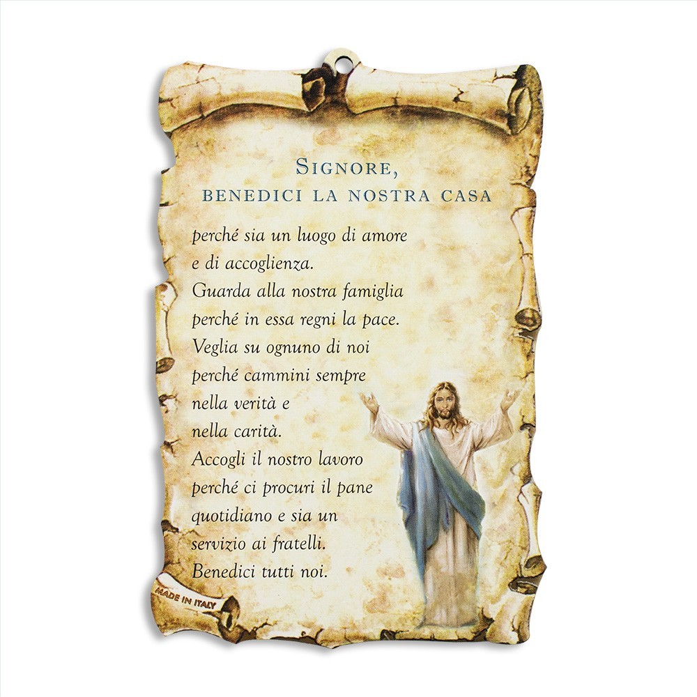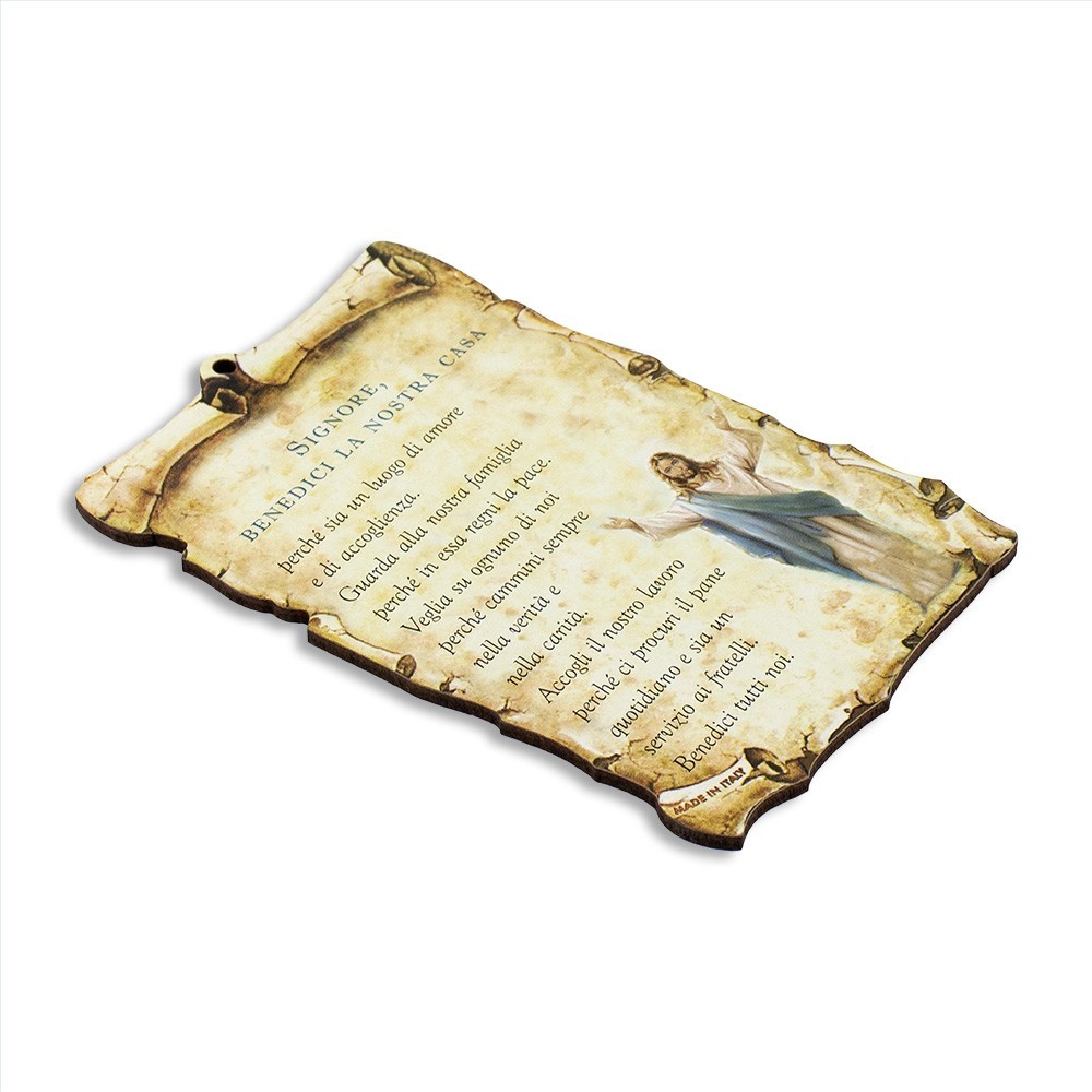 Quadretto formato pergamena completo di foro per essere appeso. Su ogni tavoletta in legno vi è stampata la Preghiera di Benedizione delle Famiglie nelle case.