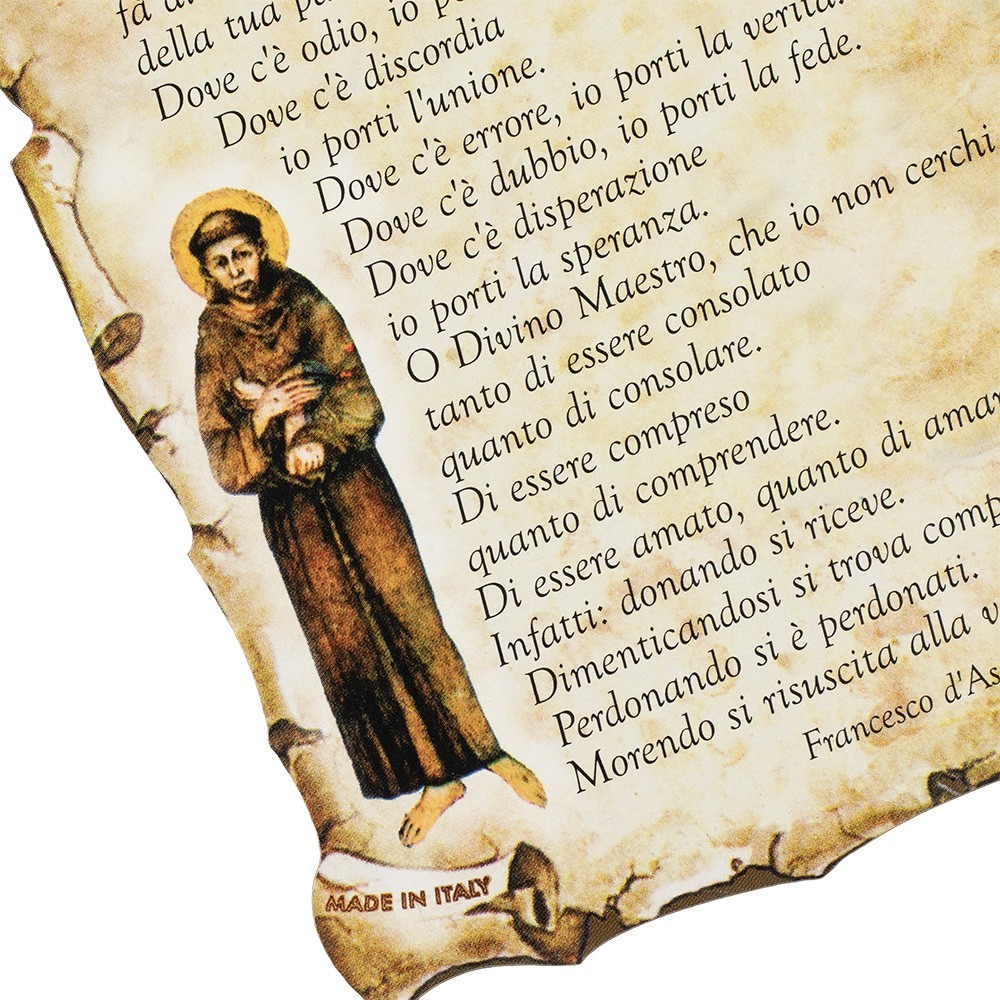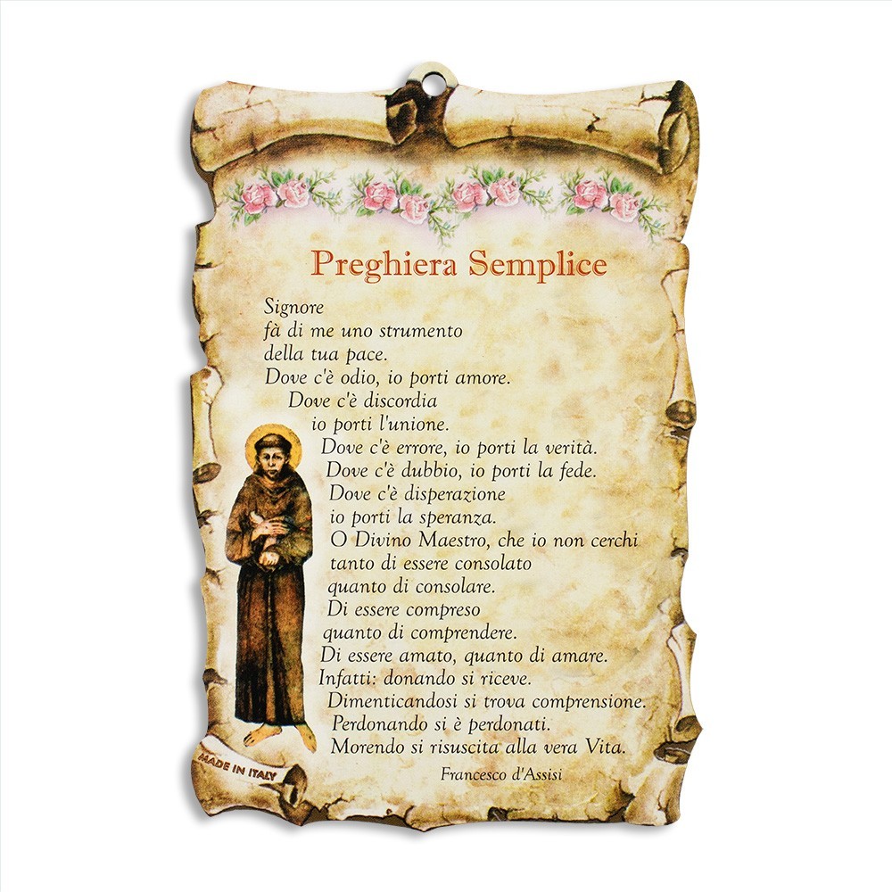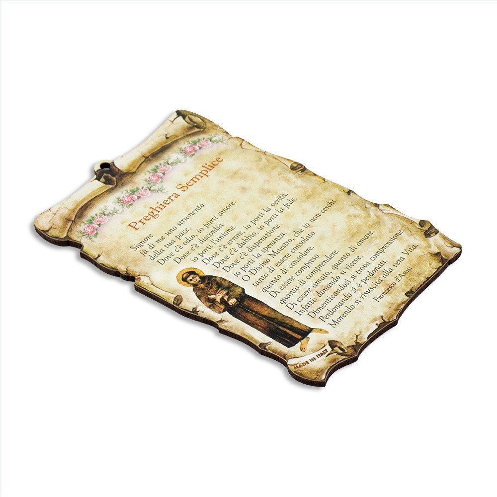 Quadretto con immagine di San Francesco d'Assisi e preghiera Semplice. Il quadretto è realizzato in legno (MDF) a forma di pergamena ed è munito di foro per appenderlo. Il quadretto può essere adatto come regalo, bomboniera o in qualsiasi occasione particolare.