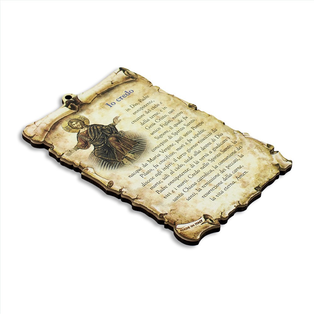 Quadretto sacro a forma di pergamena con preghiera stampata IO CREDO. Completo di foro per appenderlo.