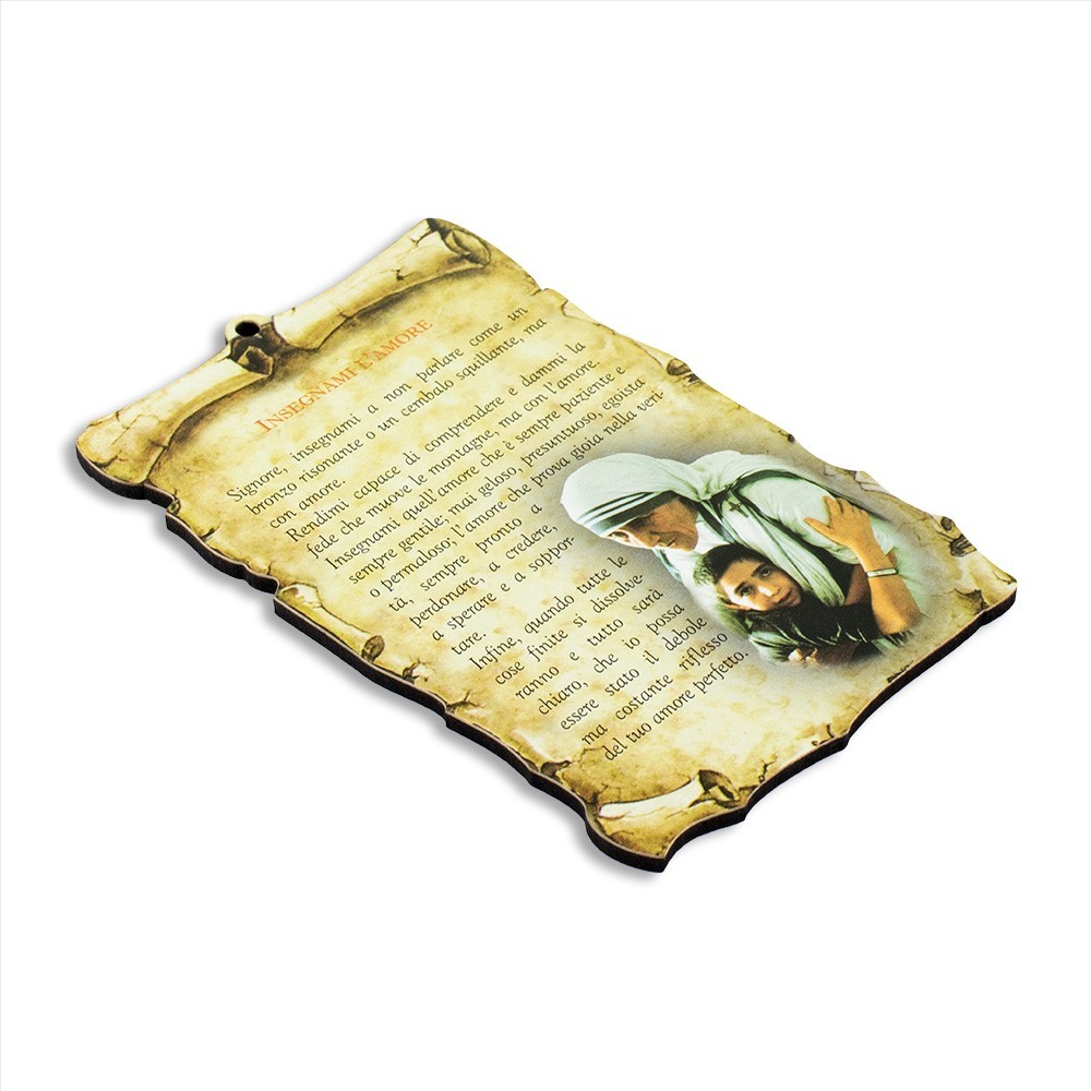 Quadretto realizzato in legno (MDF) a forma di pergamena con preghiera stampata Insegnami l'Amore. Munito di foro per appenderlo. Il quadretto può essere adatto come regalo, bomboniera o in qualsiasi occasione particolare.