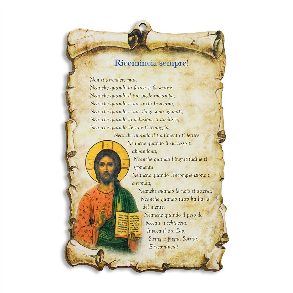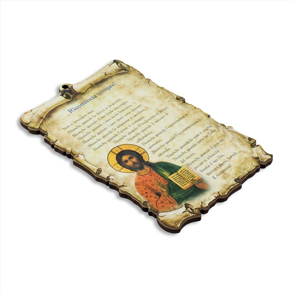 Quadretto in legno a forma di pergamena con preghiera stampata "Ricomincia Sempre ". Completo di foro per appenderlo.