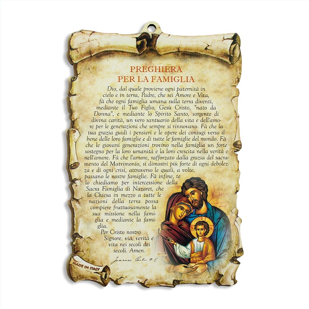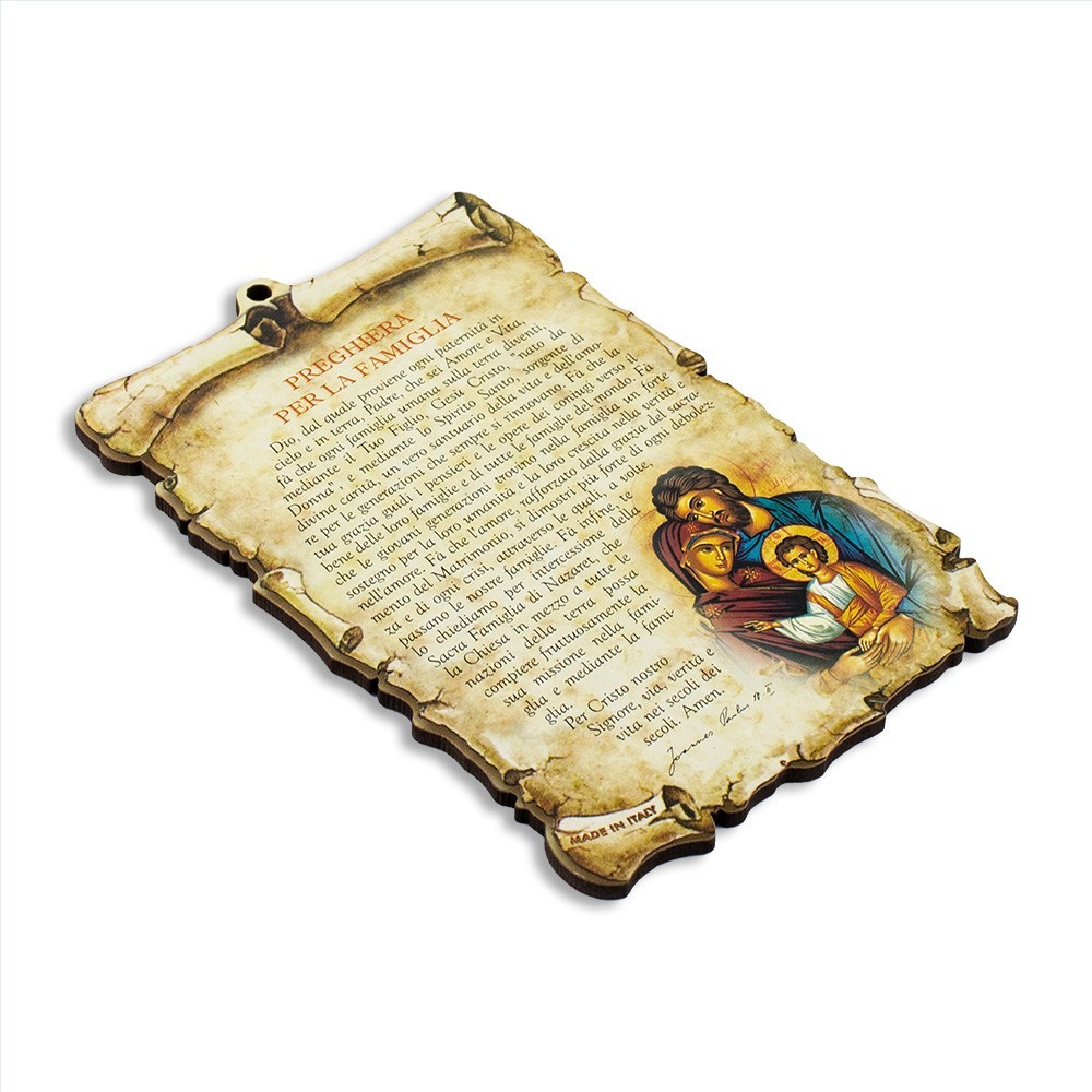 Quadretto sagomato a forma di pergamena con preghiera per la Famiglia. Realizzato interamente in MDF e munito di foro per essere appeso.