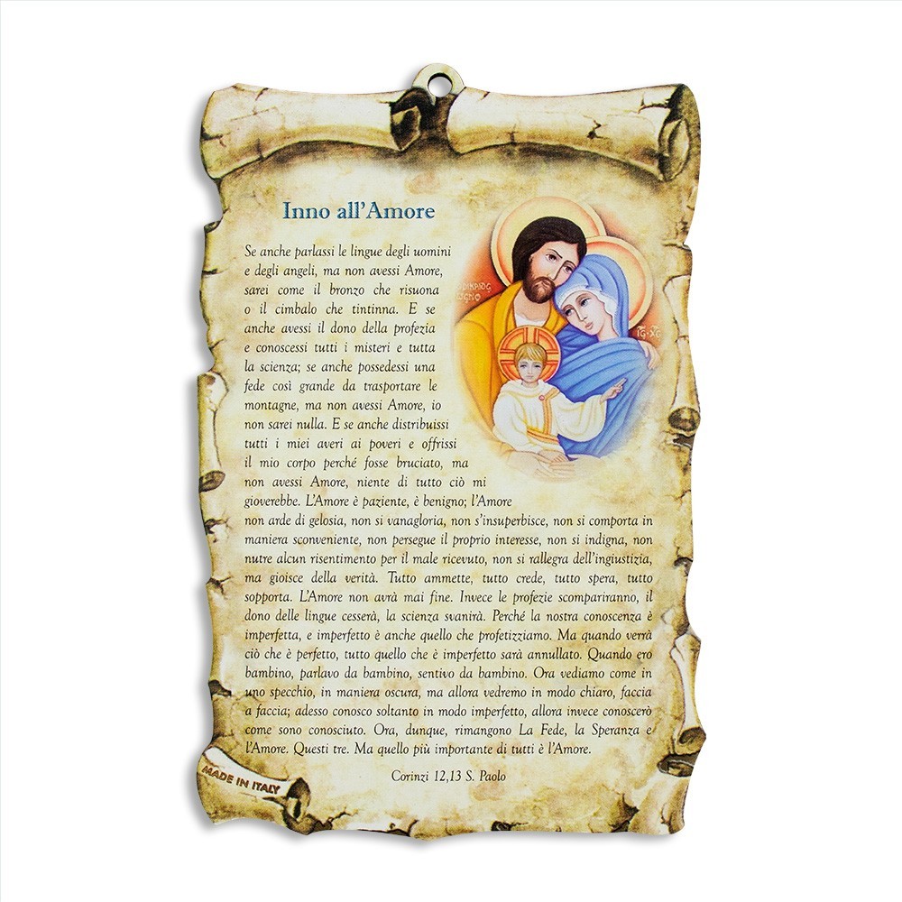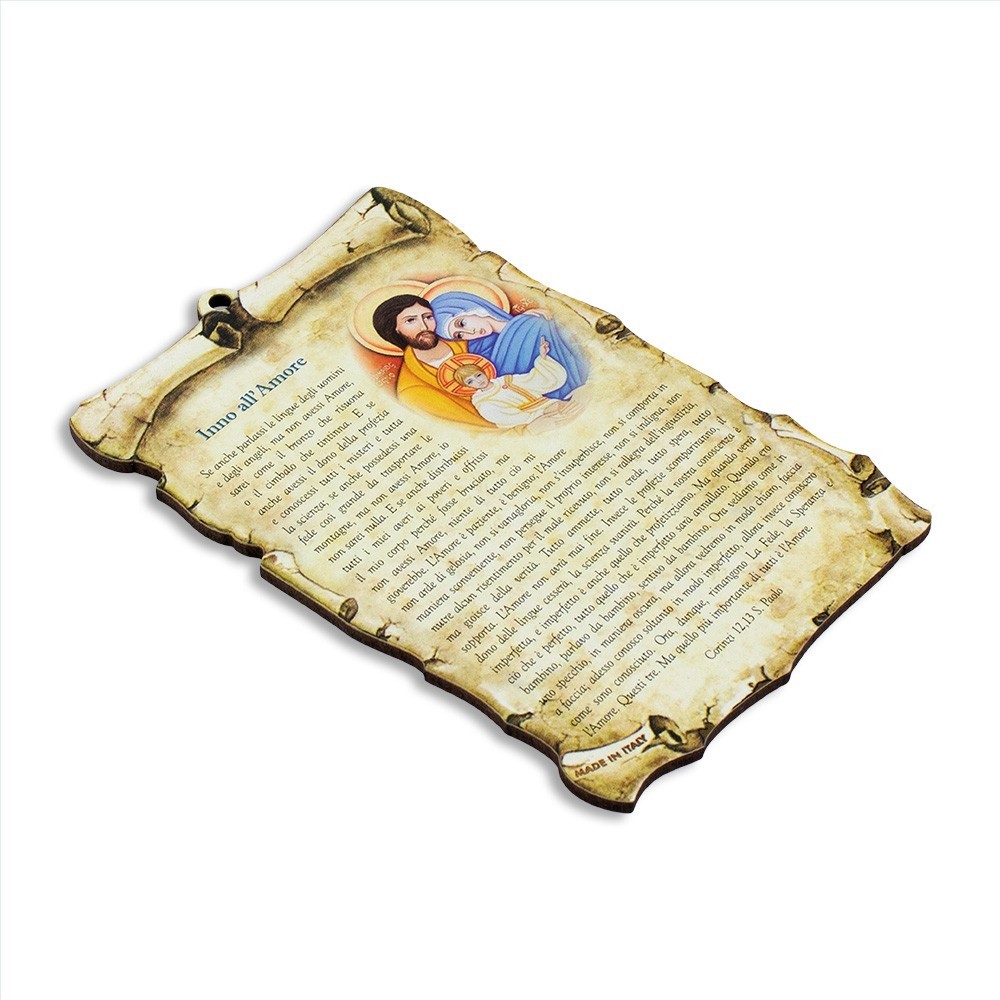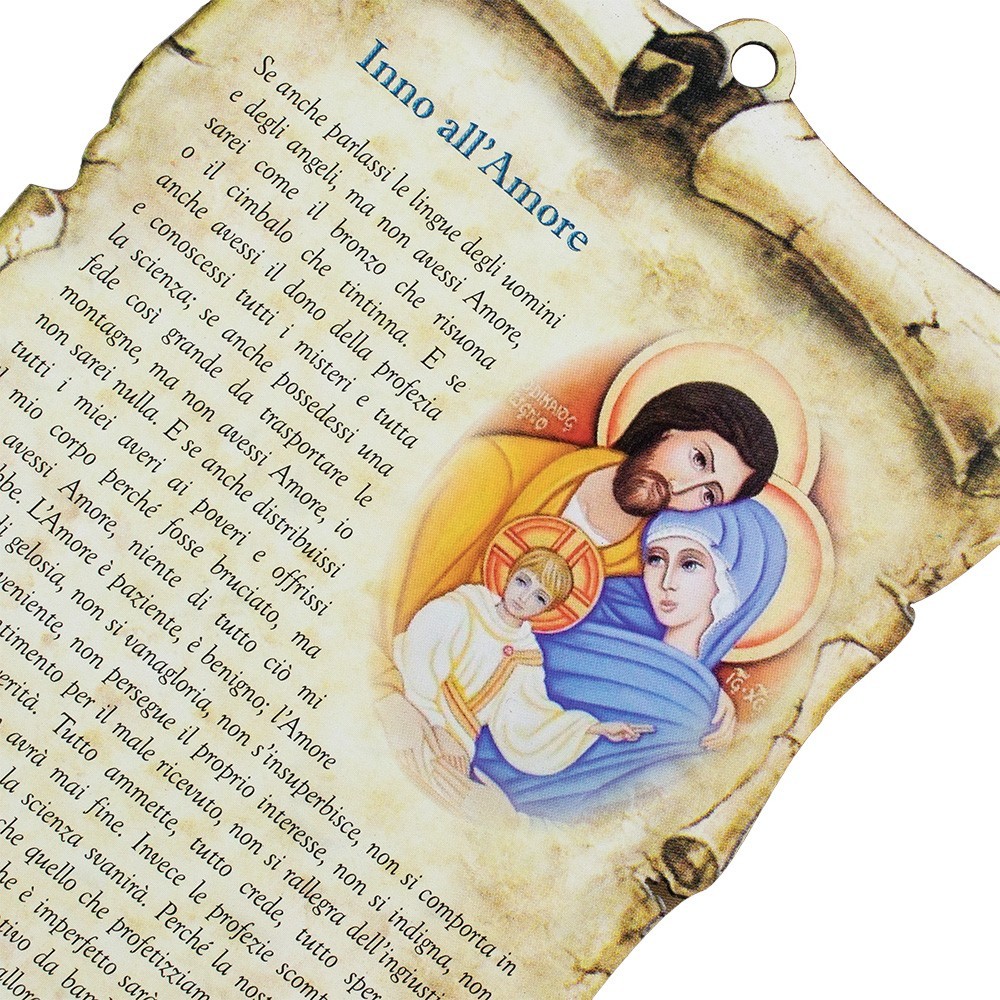 Tavoletta a forma di pergamena con foro e preghiera " Inno all'Amore ".