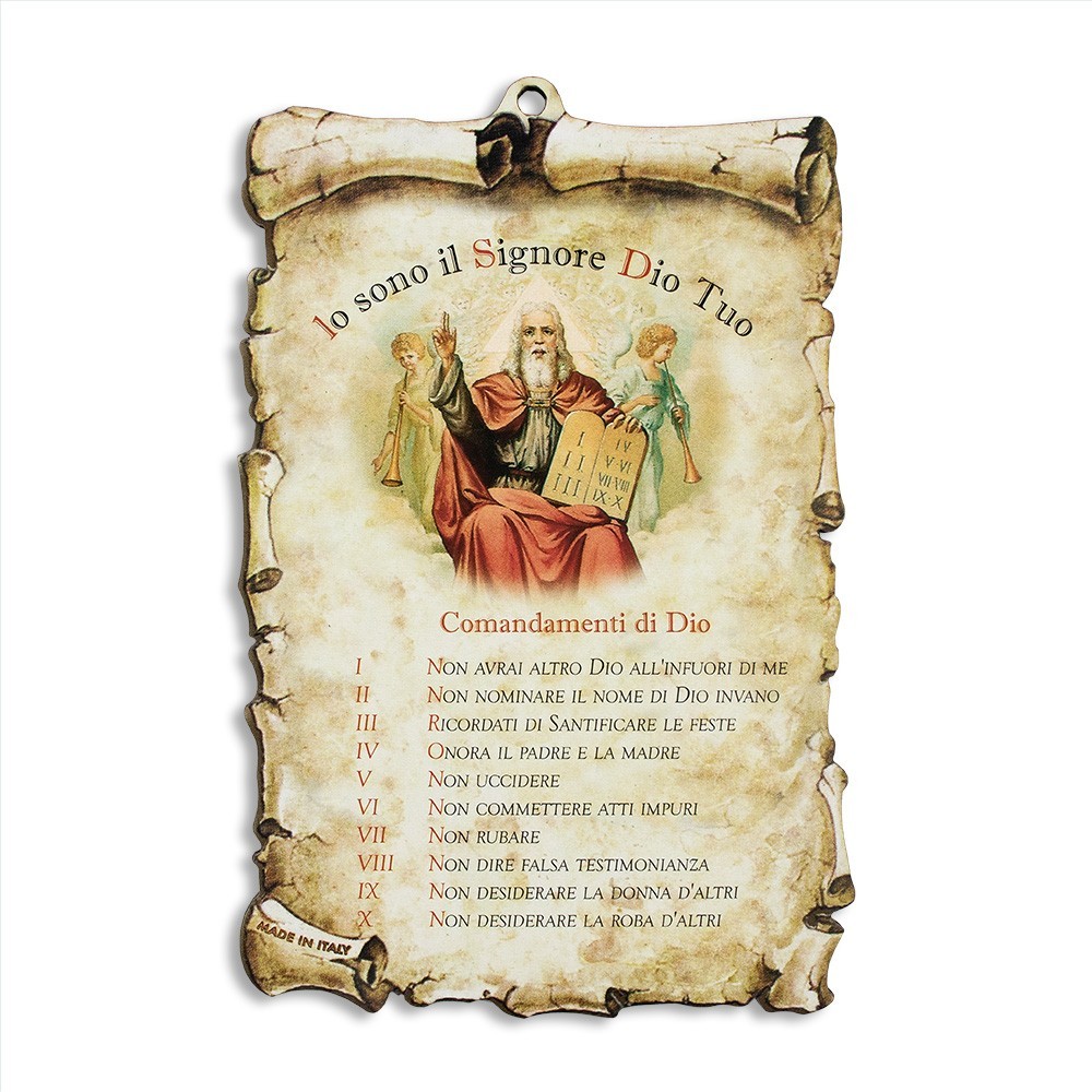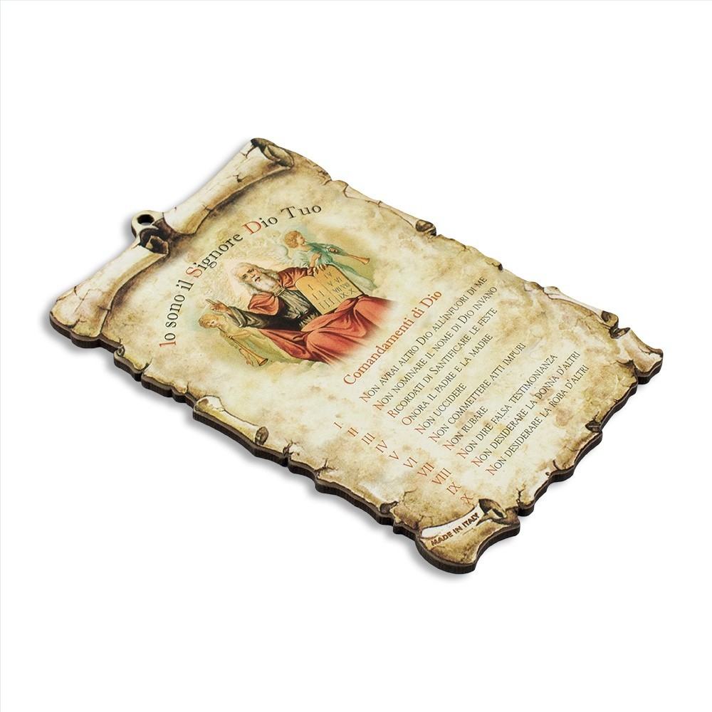 Quadretto in legno (MDF) realizzato a forma di pergamena. Su ogni quadretto vi sono stampari i Comandamenti di Dio. Il quadretto è completo di foro per essere appeso, misura 13x9 cm.