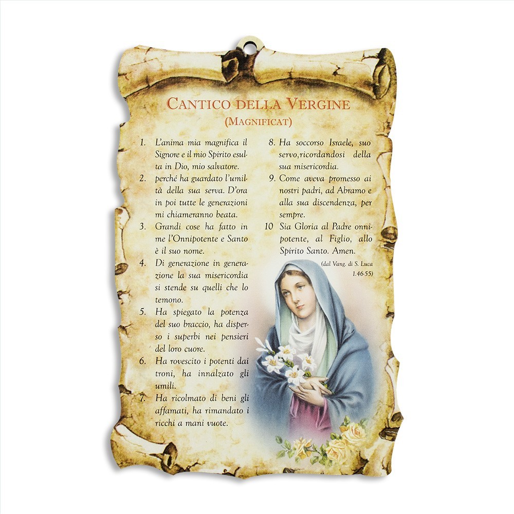 Preghiera Cantico della Vergine. Su ogni quadretto vi è stampata la preghiera " Cantico della Vergine ". Il quadretto è sagomato tipo pergamena ed è completo di foro per essere appeso.