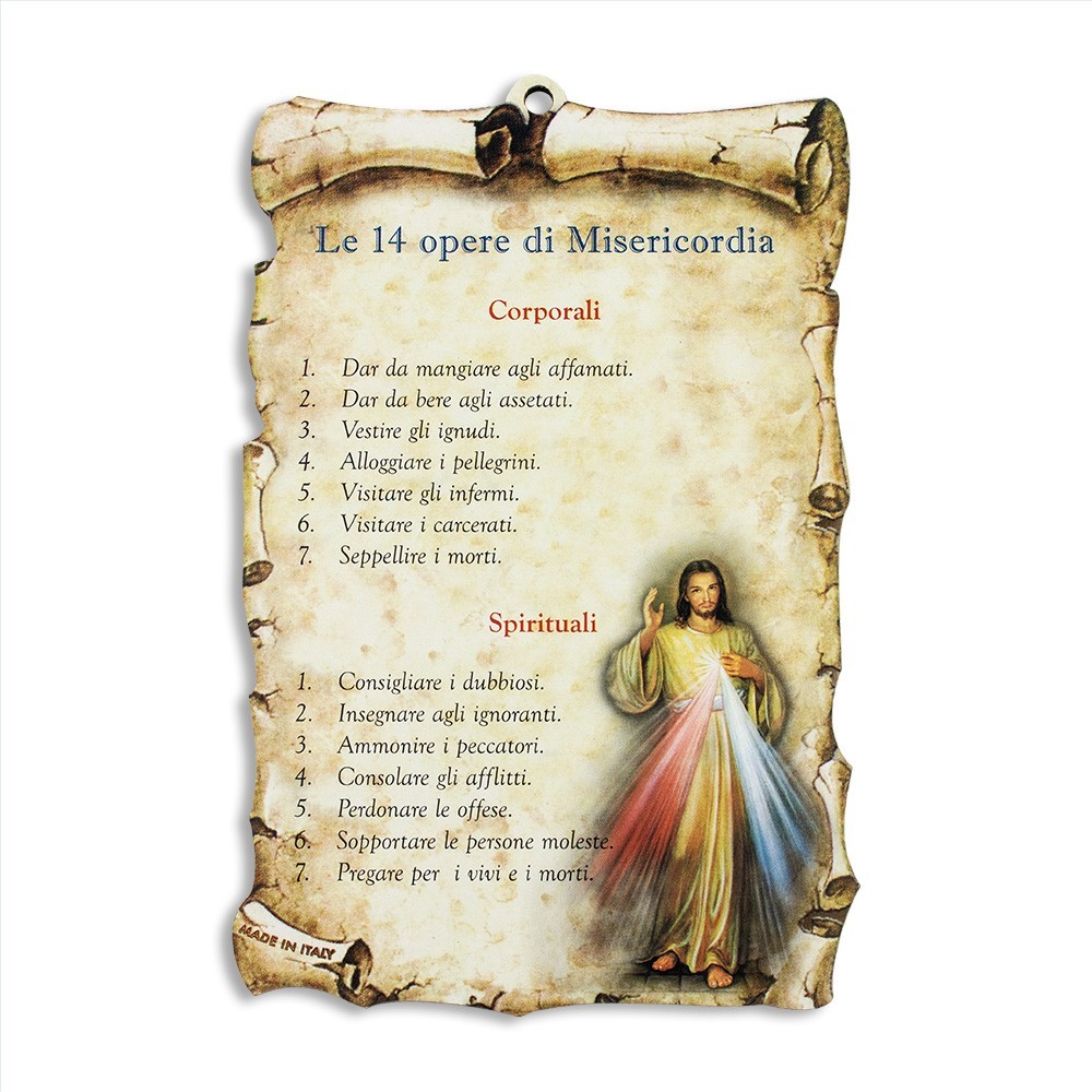 Tavoletta in legno le 14 Opere di Misericordia (Corporali e Spirituali) . Il quadretto si presenta a forma di pergamena con foro per essere appeso.