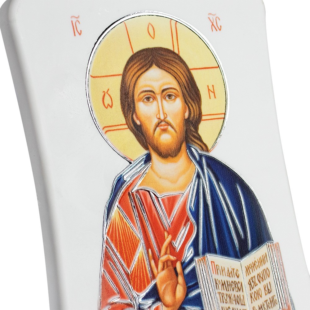 Quadretti da parete e d'appoggio realizzati in polimero effetto pietra con immagine stampata. Questo carinissimo quadretto è con immagine stampata di Gesù Pantocratore impreziosito con dettagli argentati. Può essere usato sia come quadretto da parete che d'appoggio (completo di triangolino e gancino in metallo). Il tutto corredato di scatola rigida.